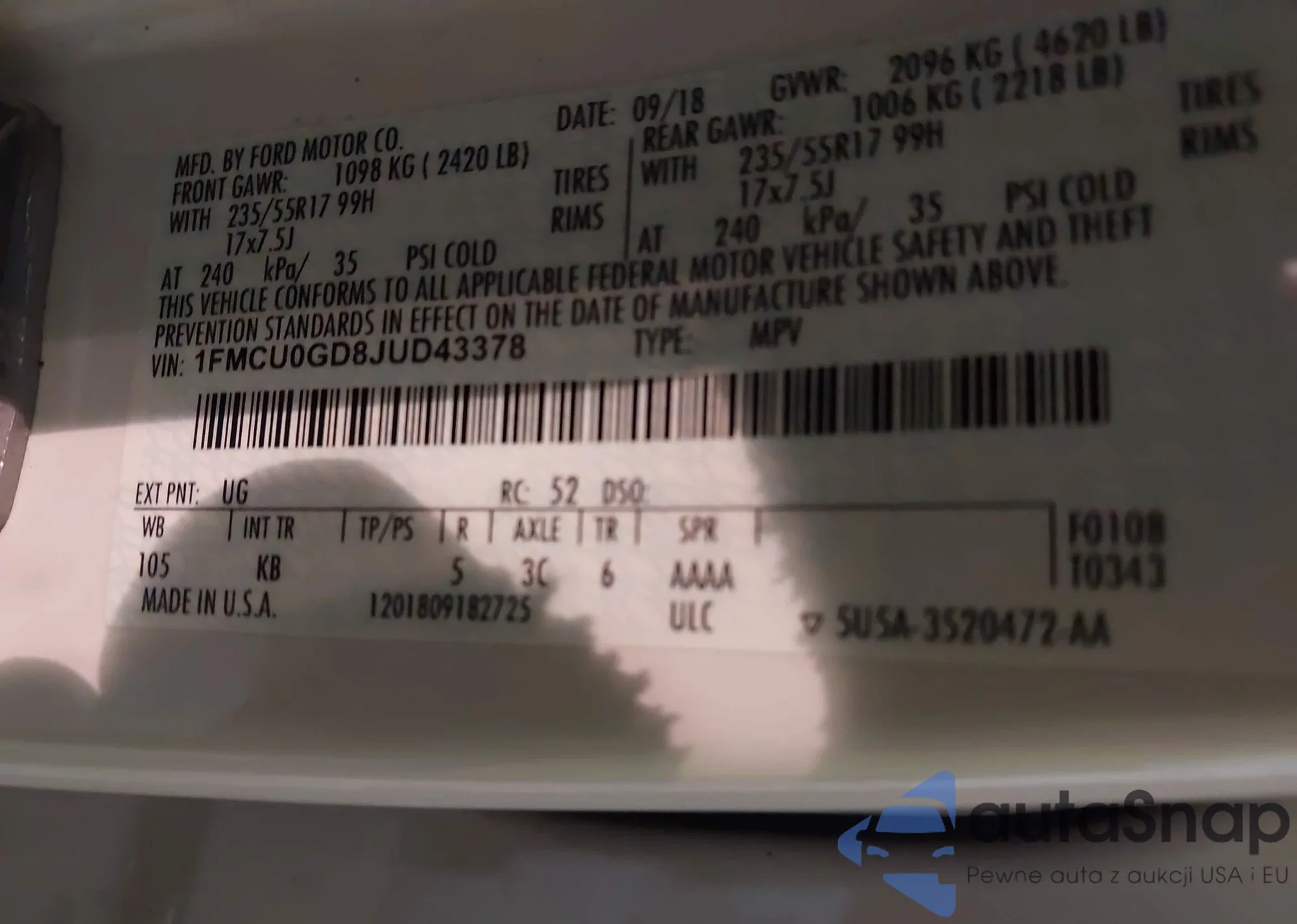 LOT: 43384350 VIN: 1FMCU0GD8JUD43378