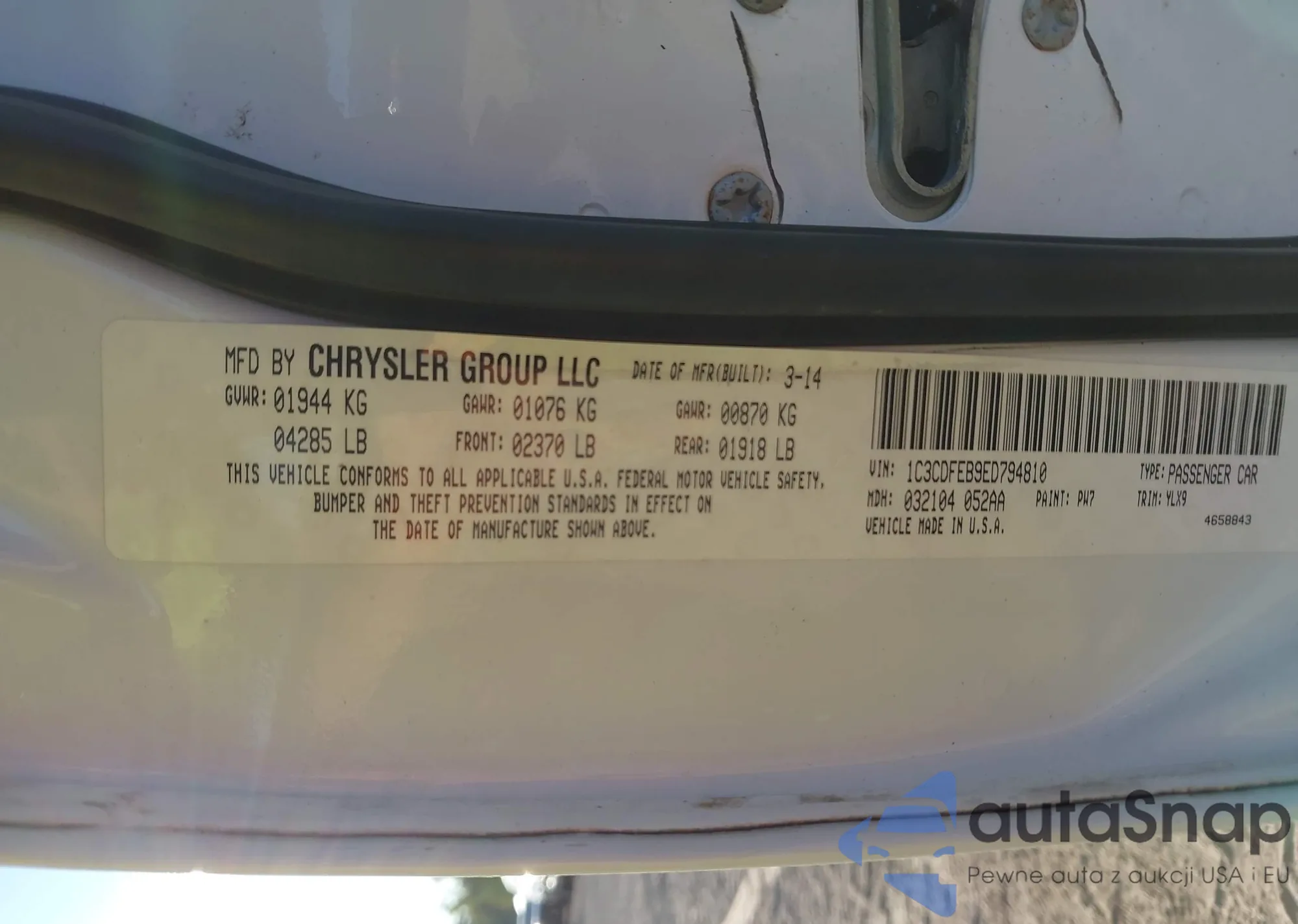 LOT: 43113317 VIN: 1C3CDFEB9ED794810