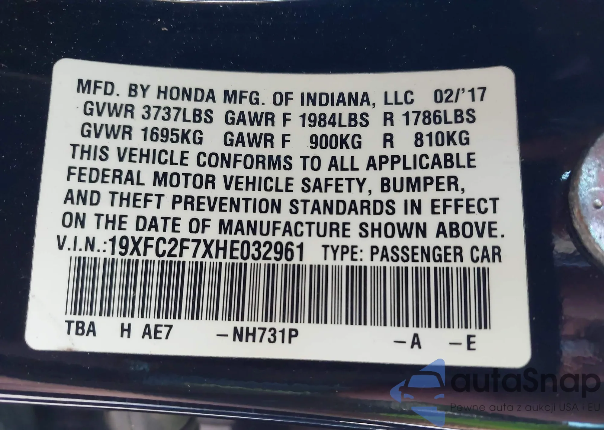 LOT: 43201413 VIN: 19XFC1F91HE026798