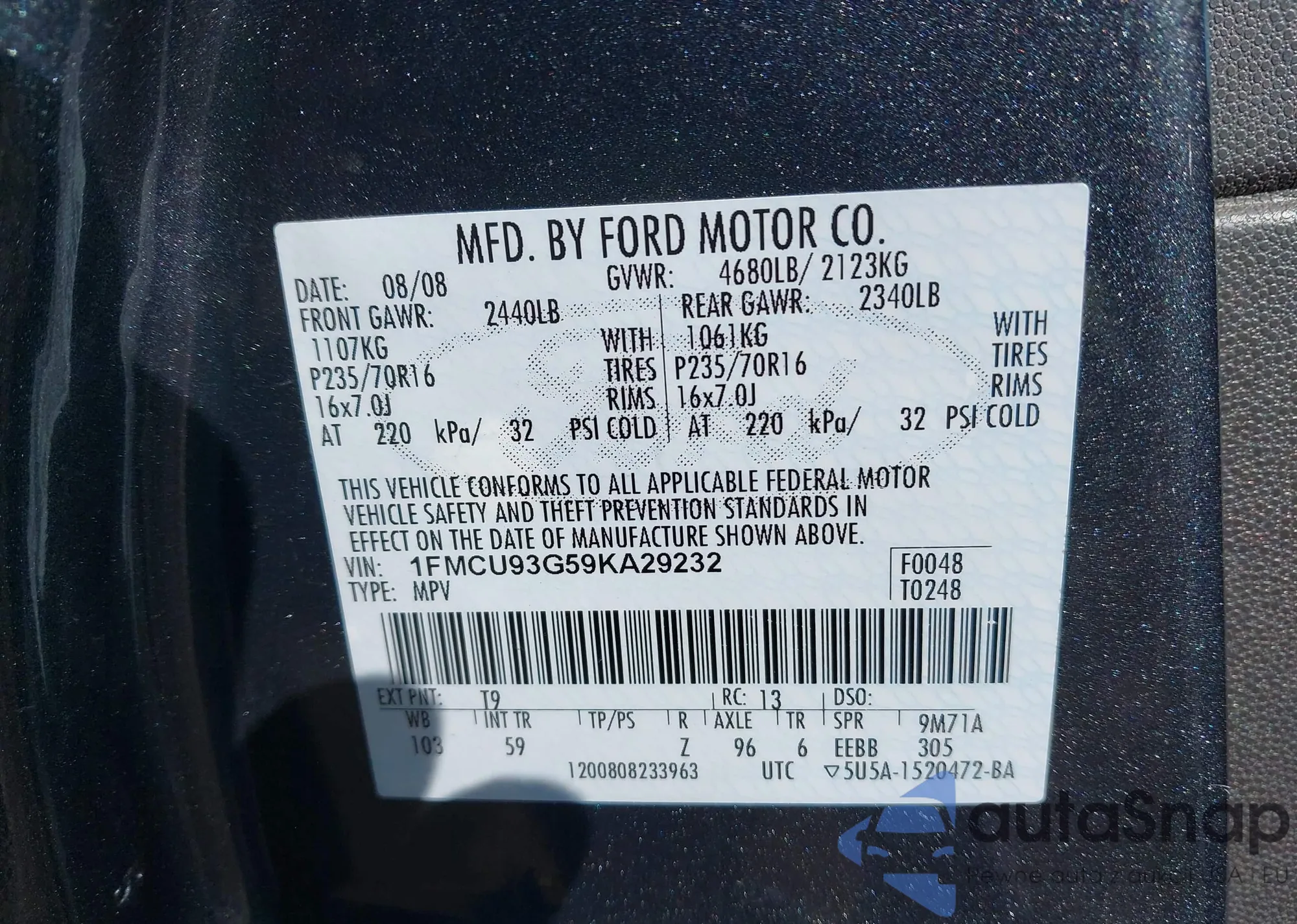 • VIN 1FMCU93G59KA29232