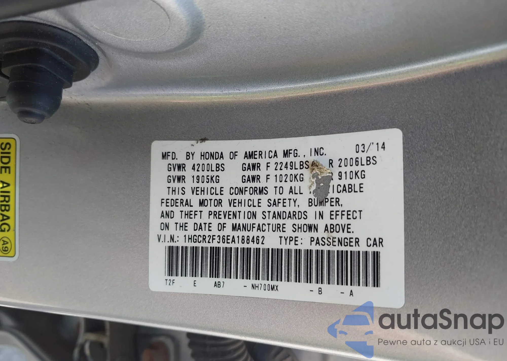 LOT: 42940008 VIN: 1HGCR2F36EA188462