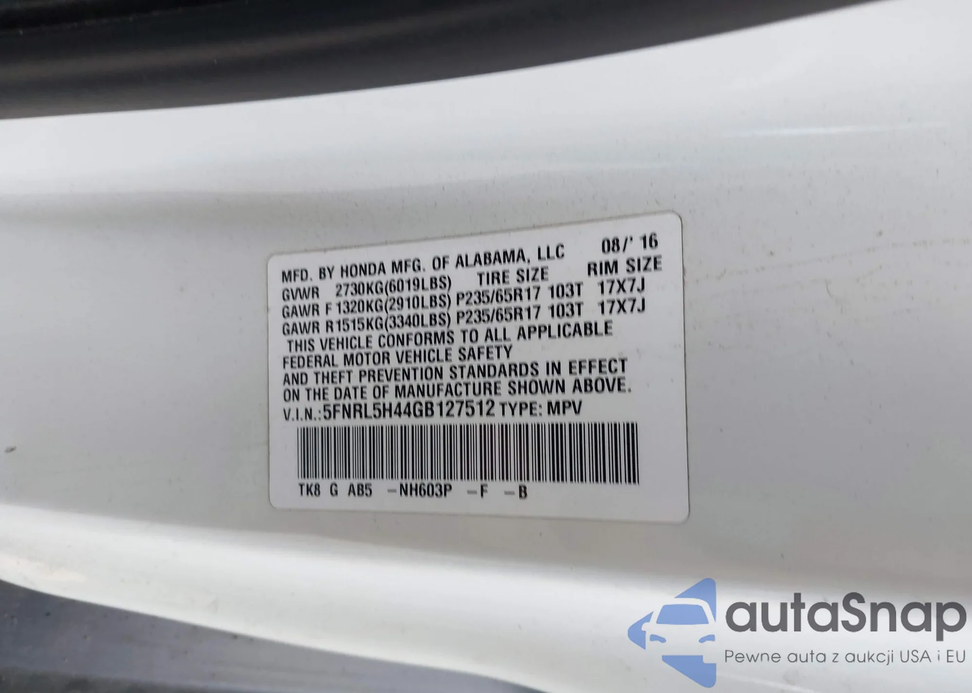 • VIN 5FNRL5H44GB127512