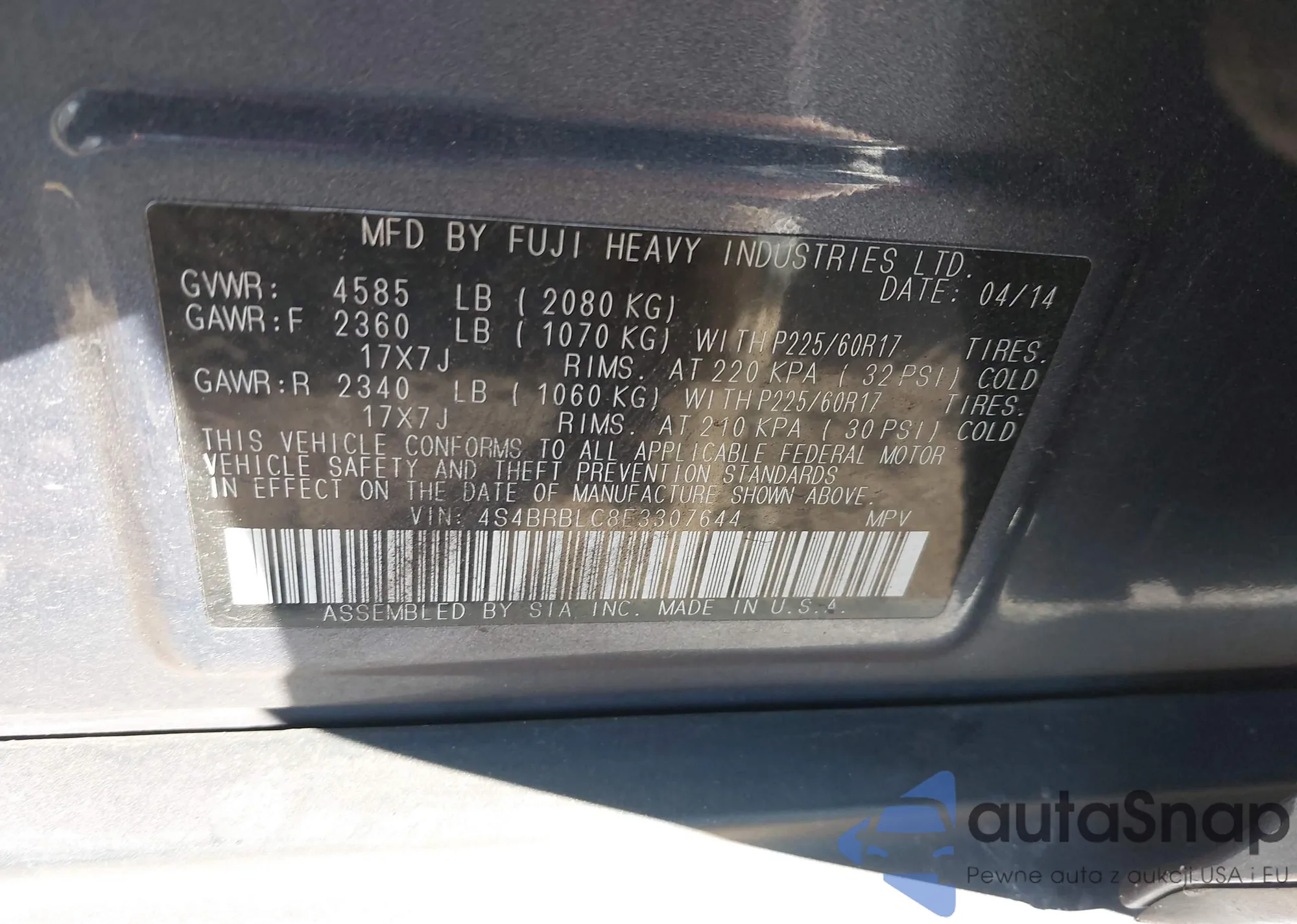 LOT: 43343857 VIN: 4S4BRBLC8E3307644