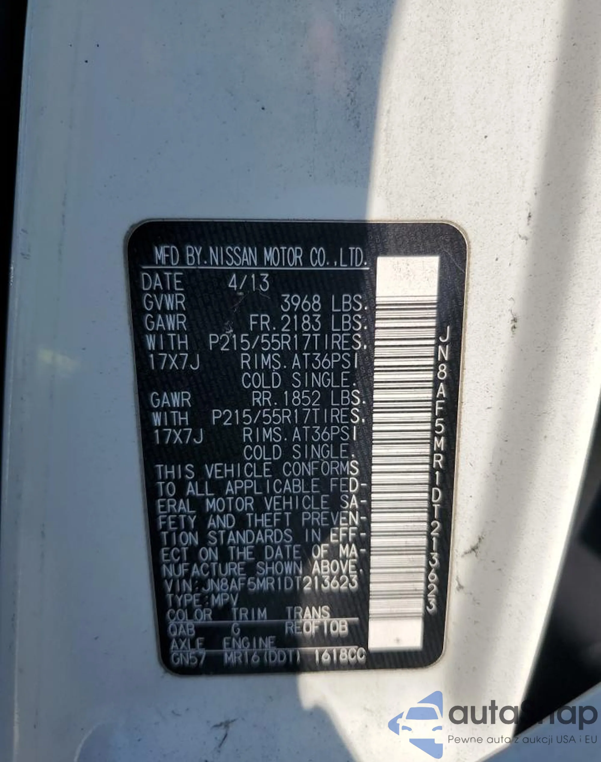 LOT: 81106425 VIN: JN8AF5MR1DT213623
