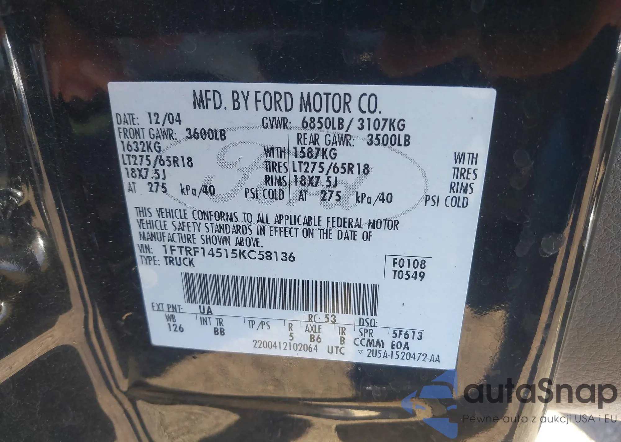 LOT: 43362396 VIN: 1FTRF14515KC58136