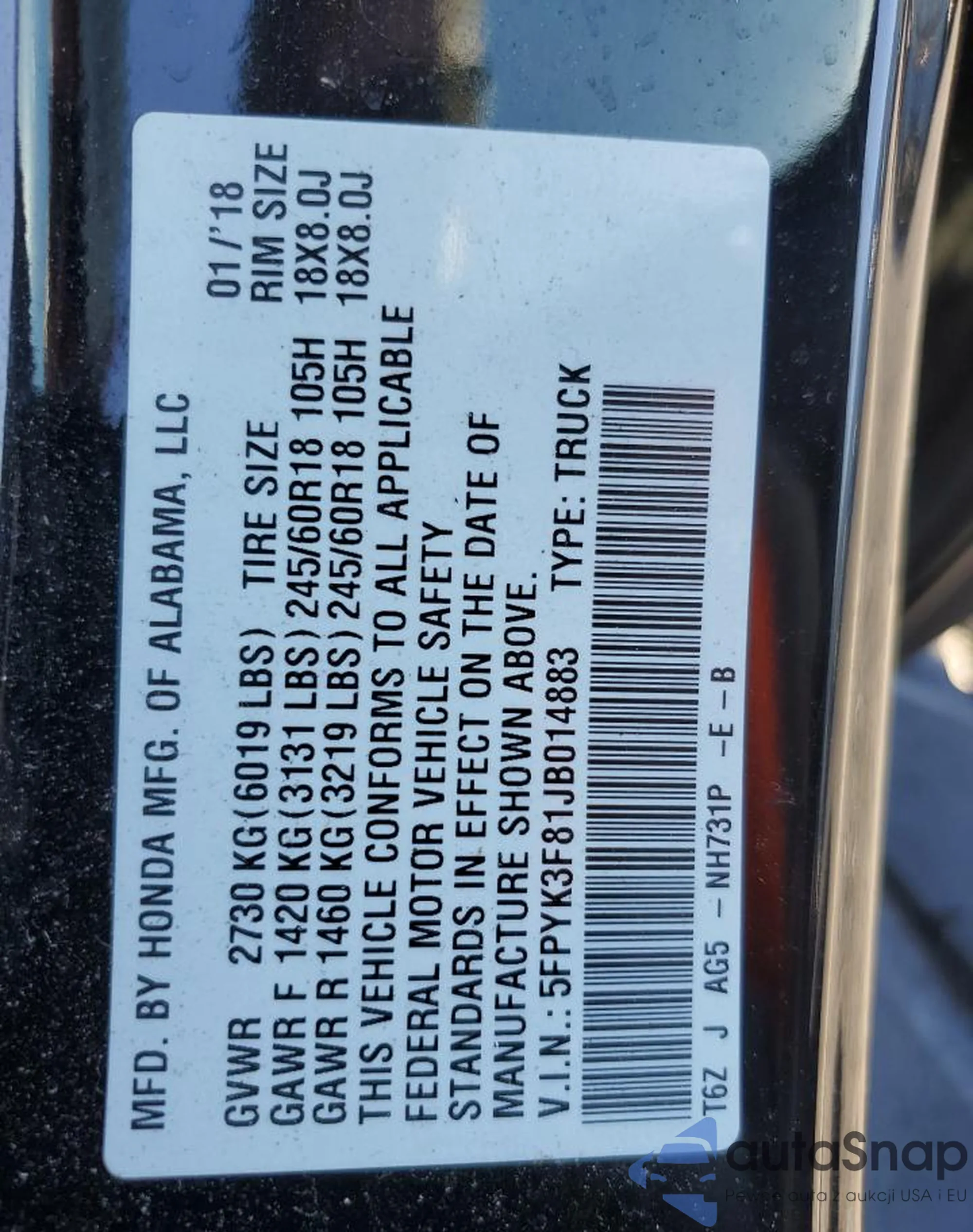 • VIN 5FPYK3F81JB014883