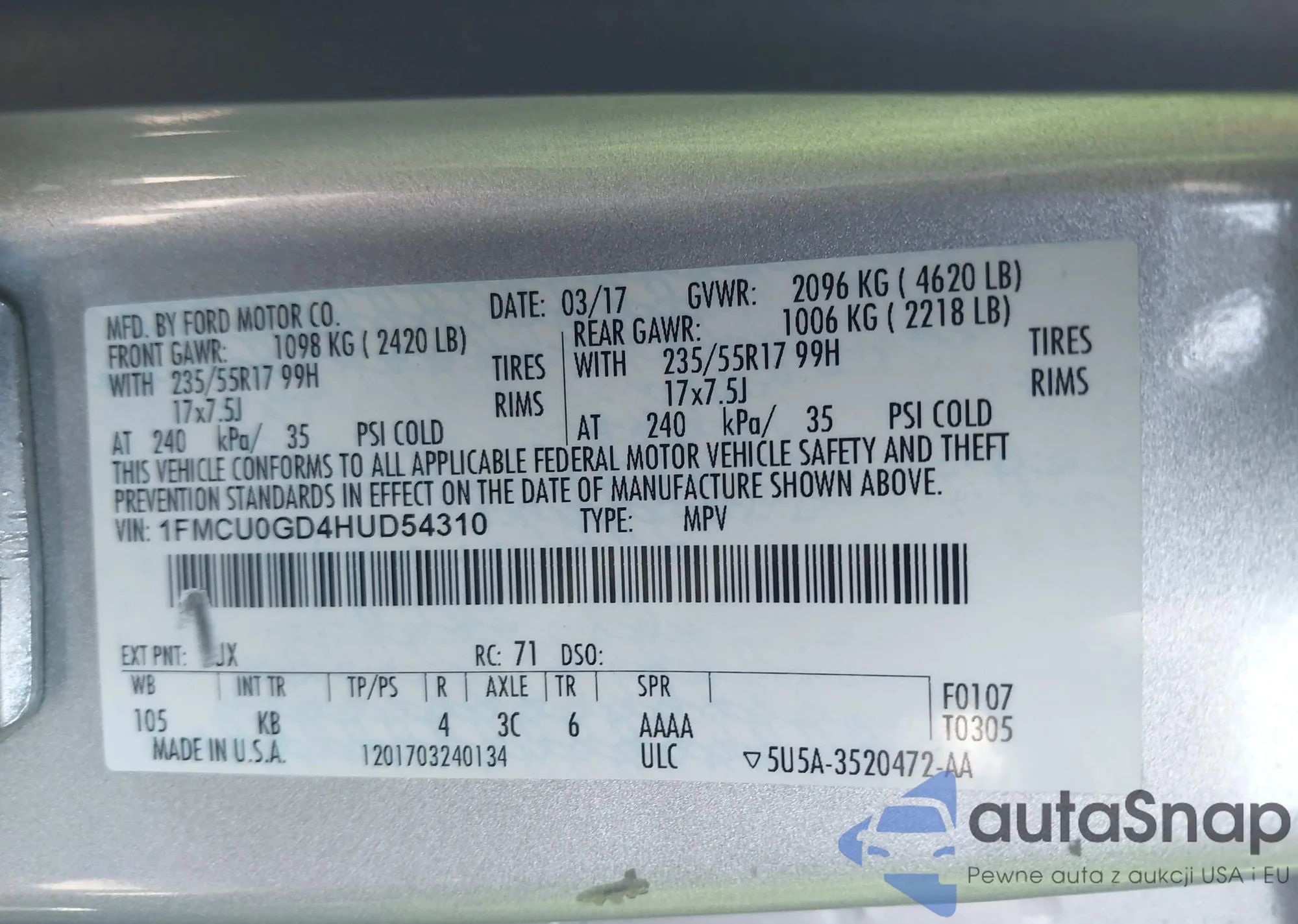 • VIN 1FMCU0GD4HUD54310