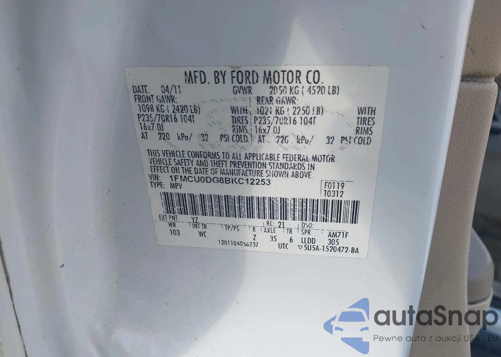 • VIN 1FMCU0DG8BKC12253