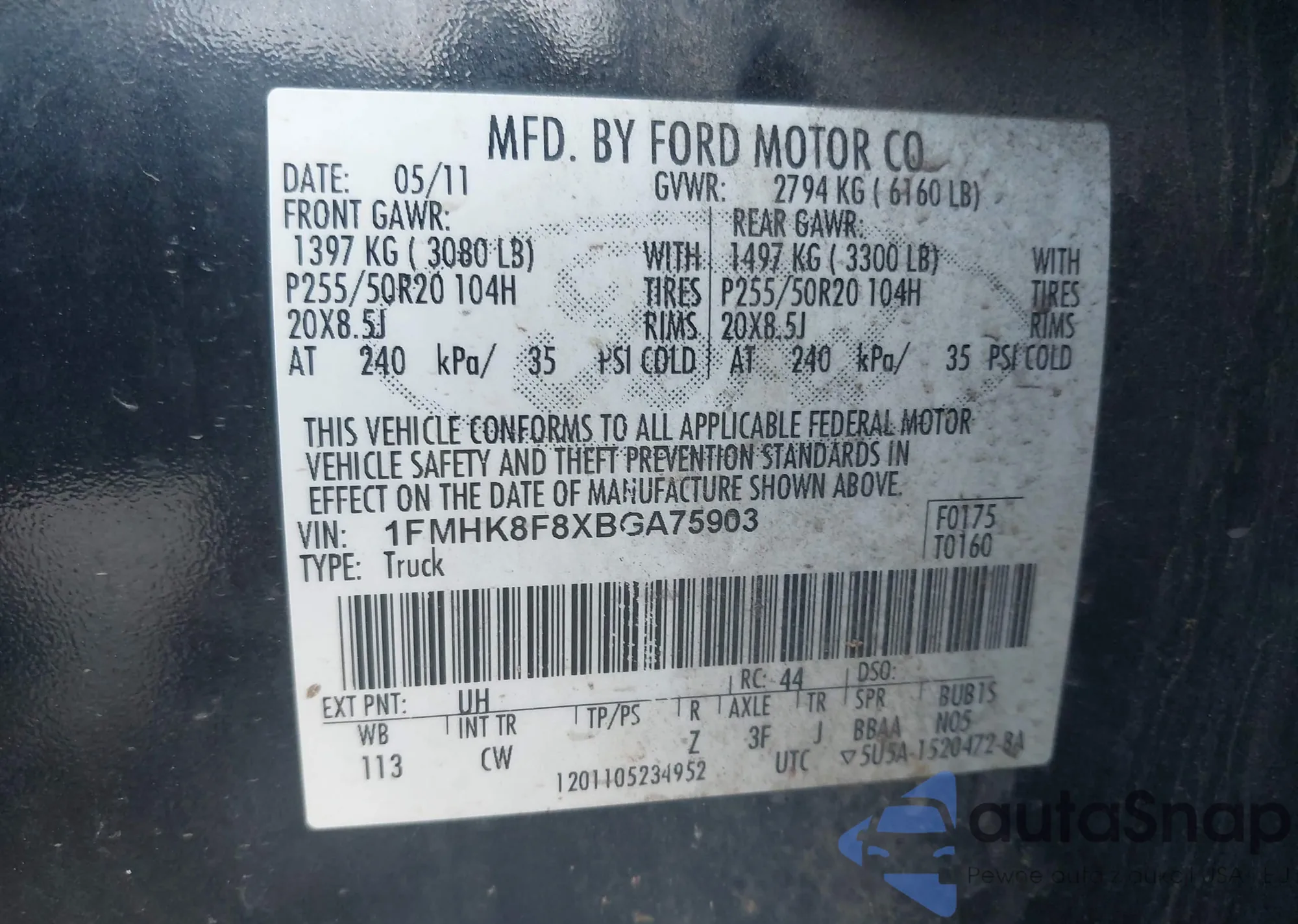 • VIN 1FMHK8F8XBGA75903