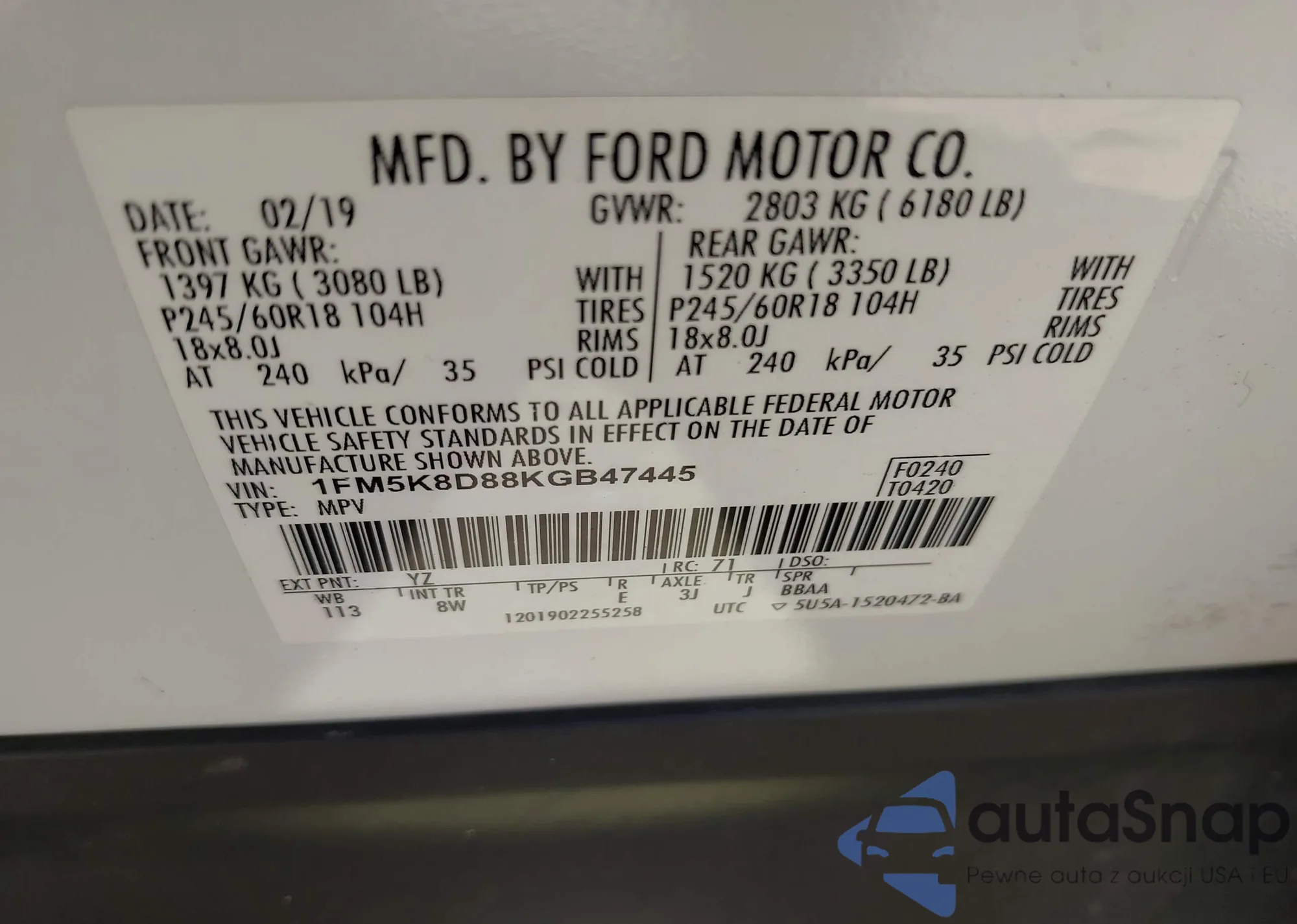 LOT: 43061851 VIN: 1FM5K8D88KGB47445