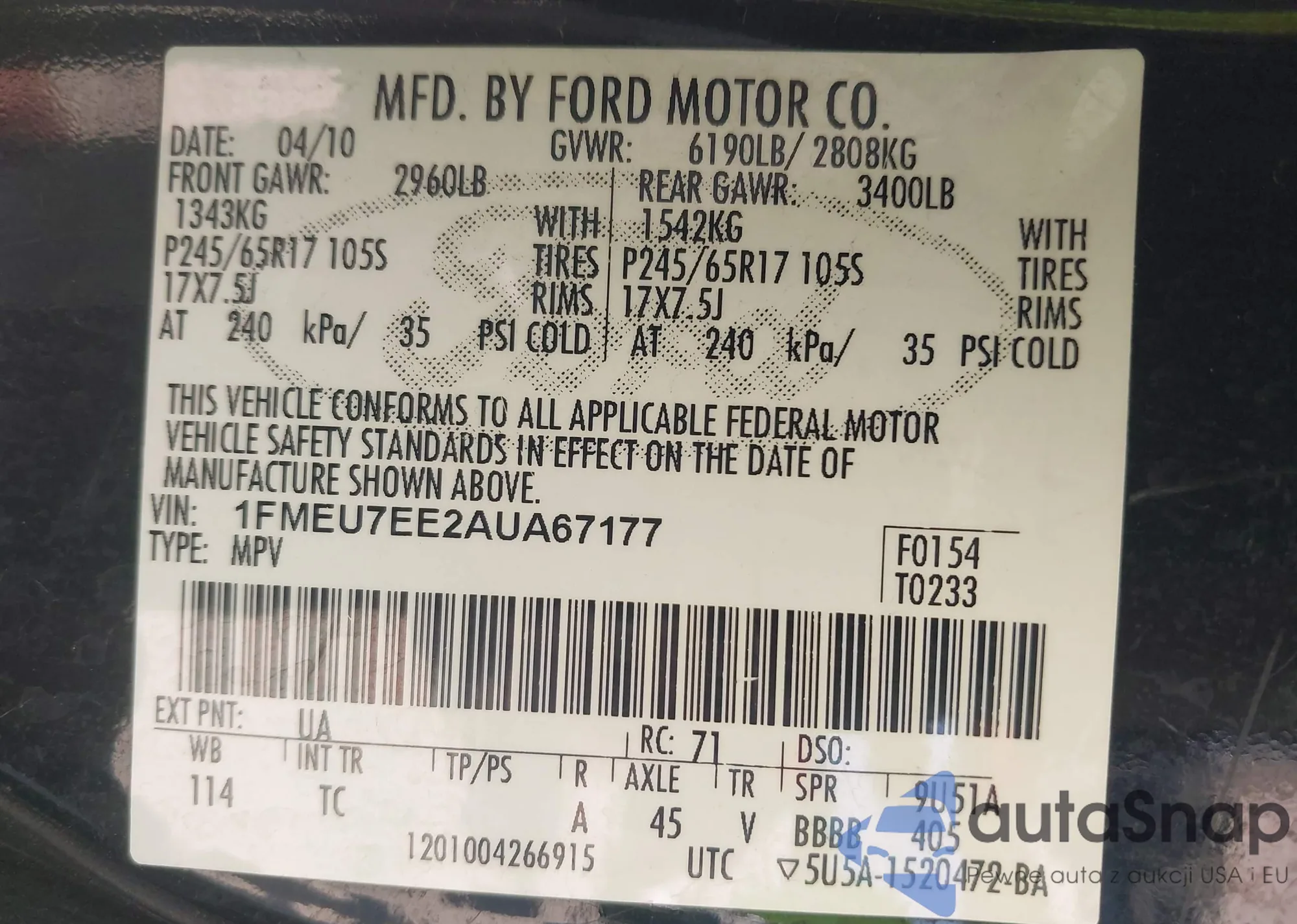 • VIN 1FMEU7EE2AUA67177