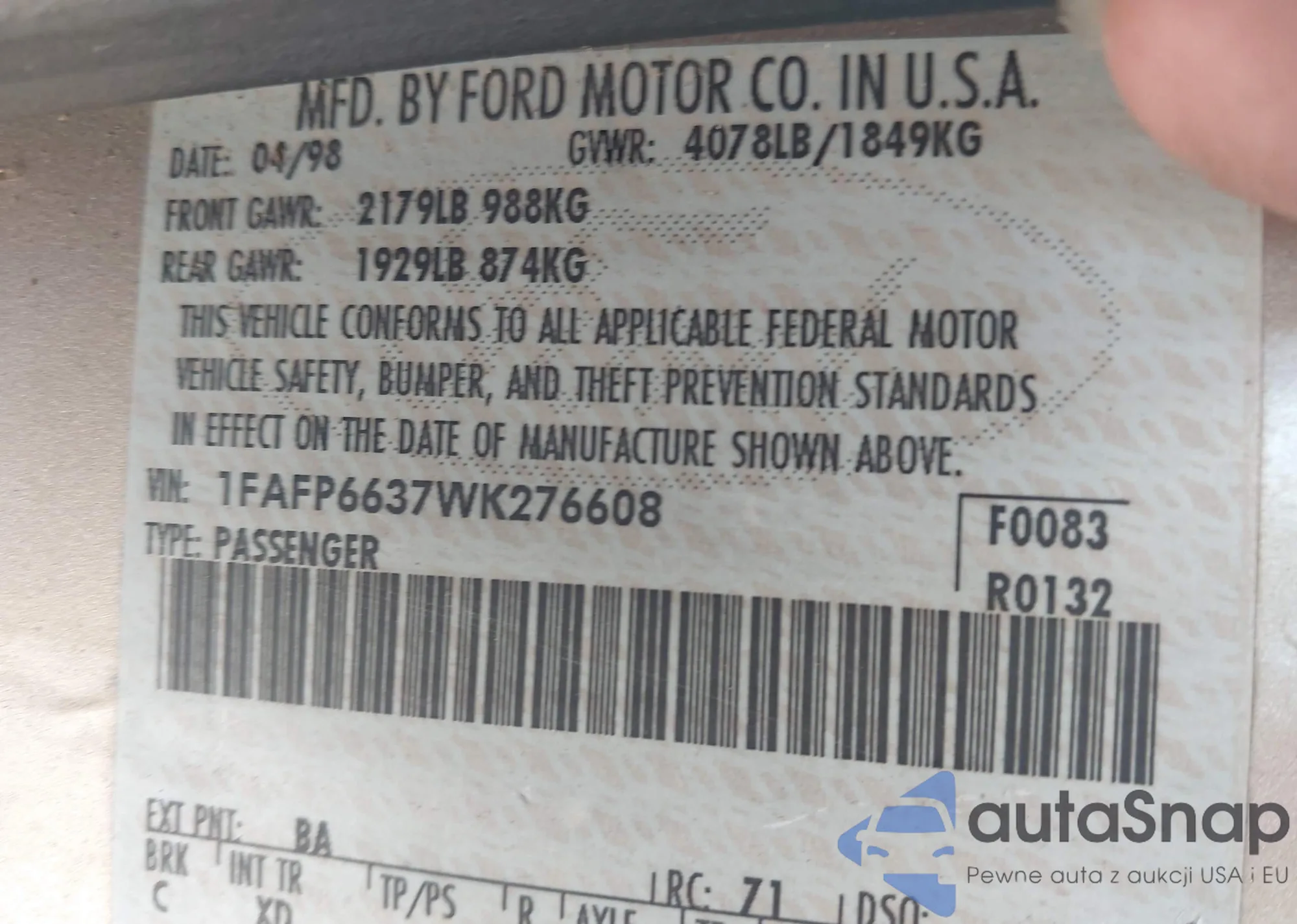 • VIN 1FAFP6637WK276608