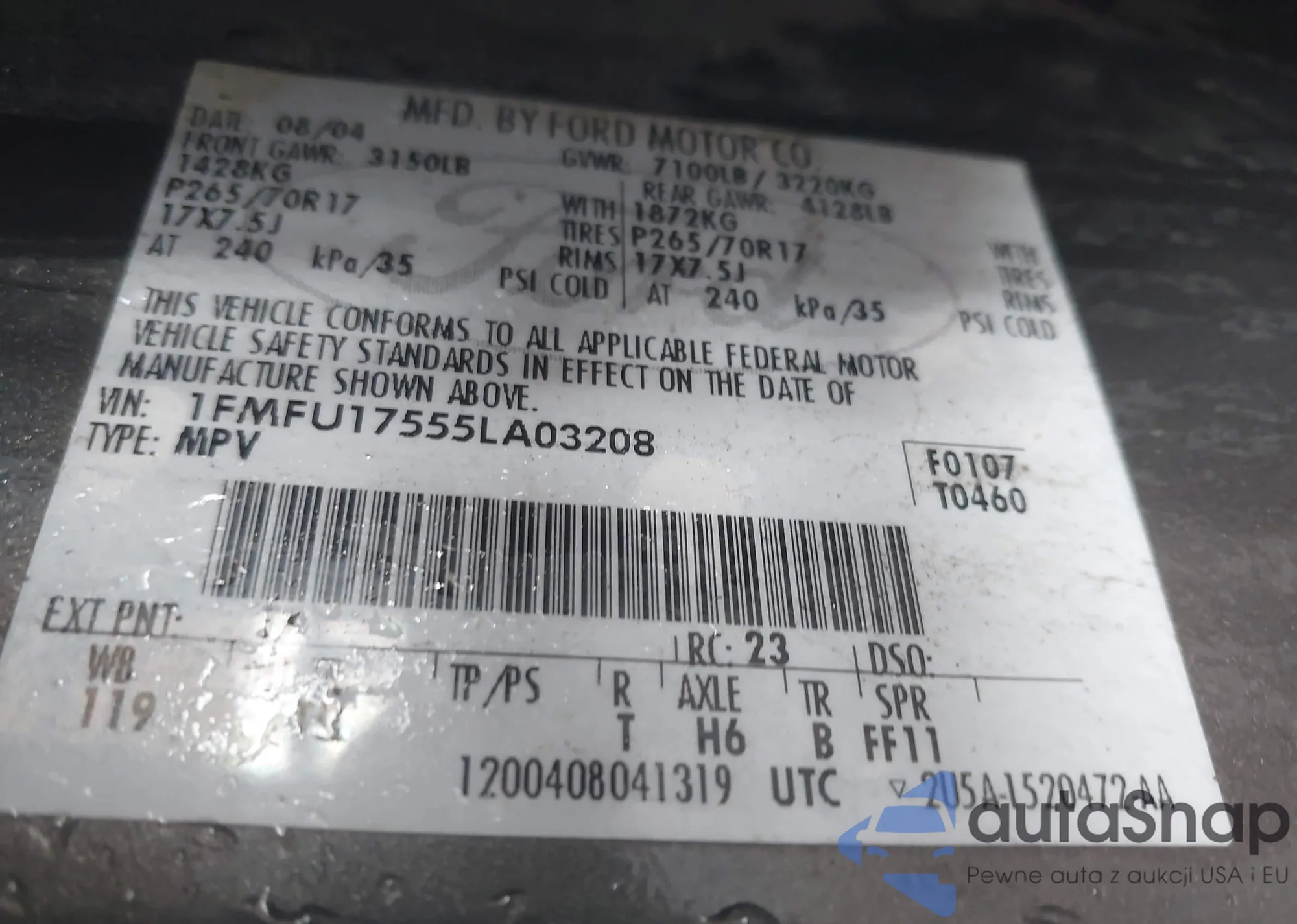 LOT: 43205586 VIN: 1FMFU17555LA03208