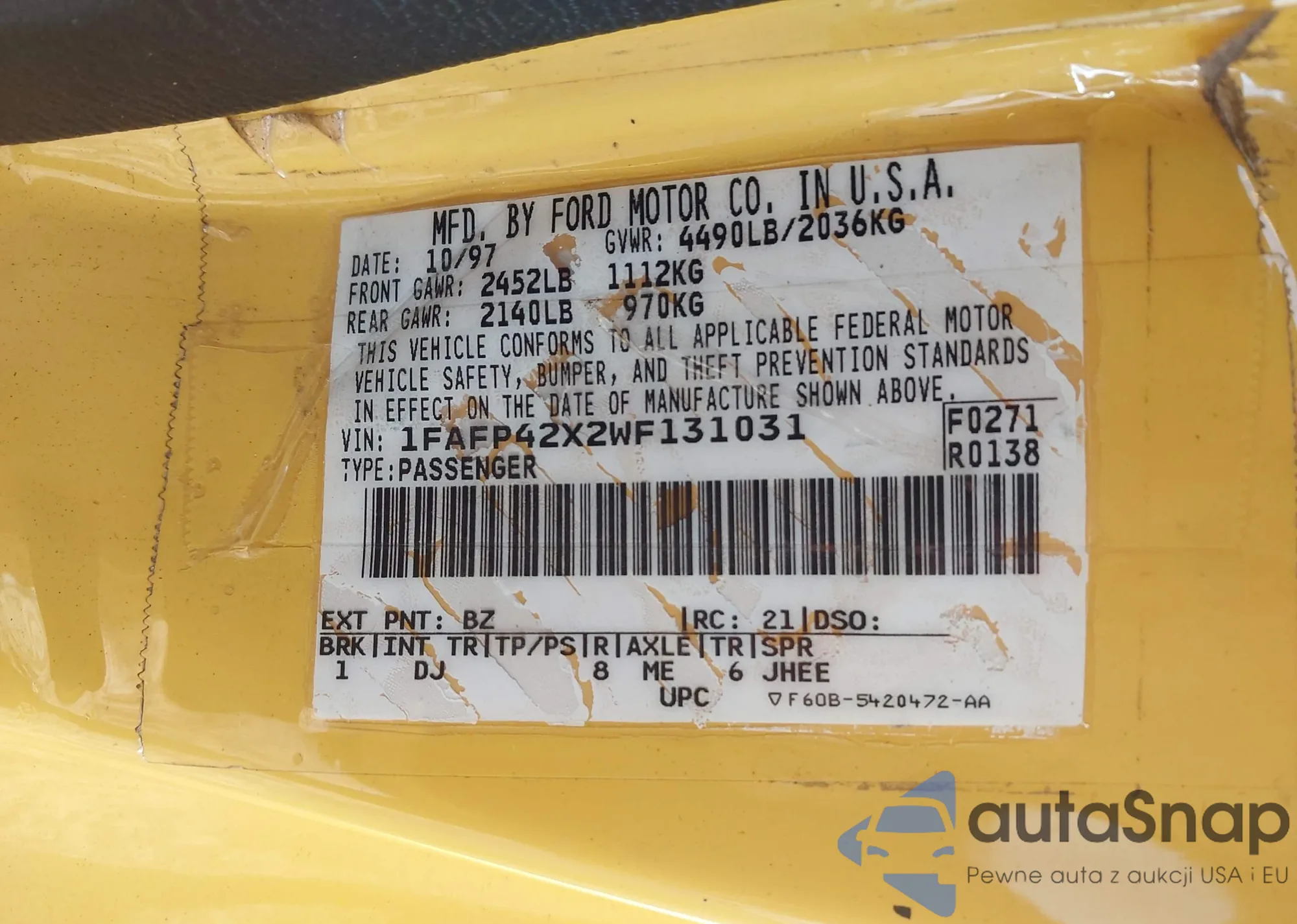 LOT: 43275791 VIN: 1FAFP42X2WF131031