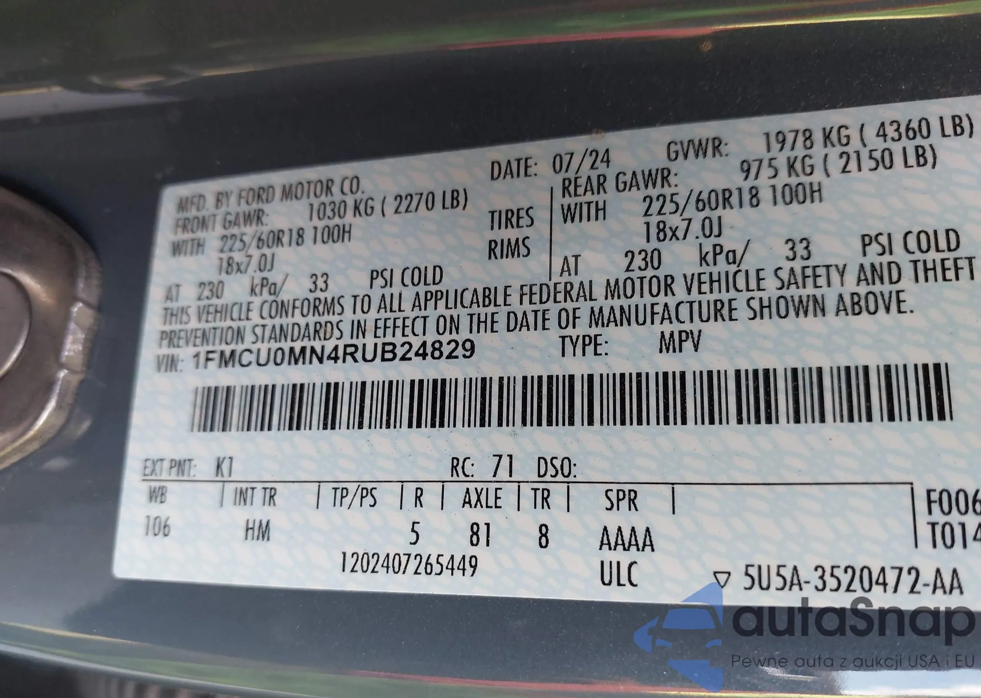 • VIN 1FMCU0MN4RUB24829