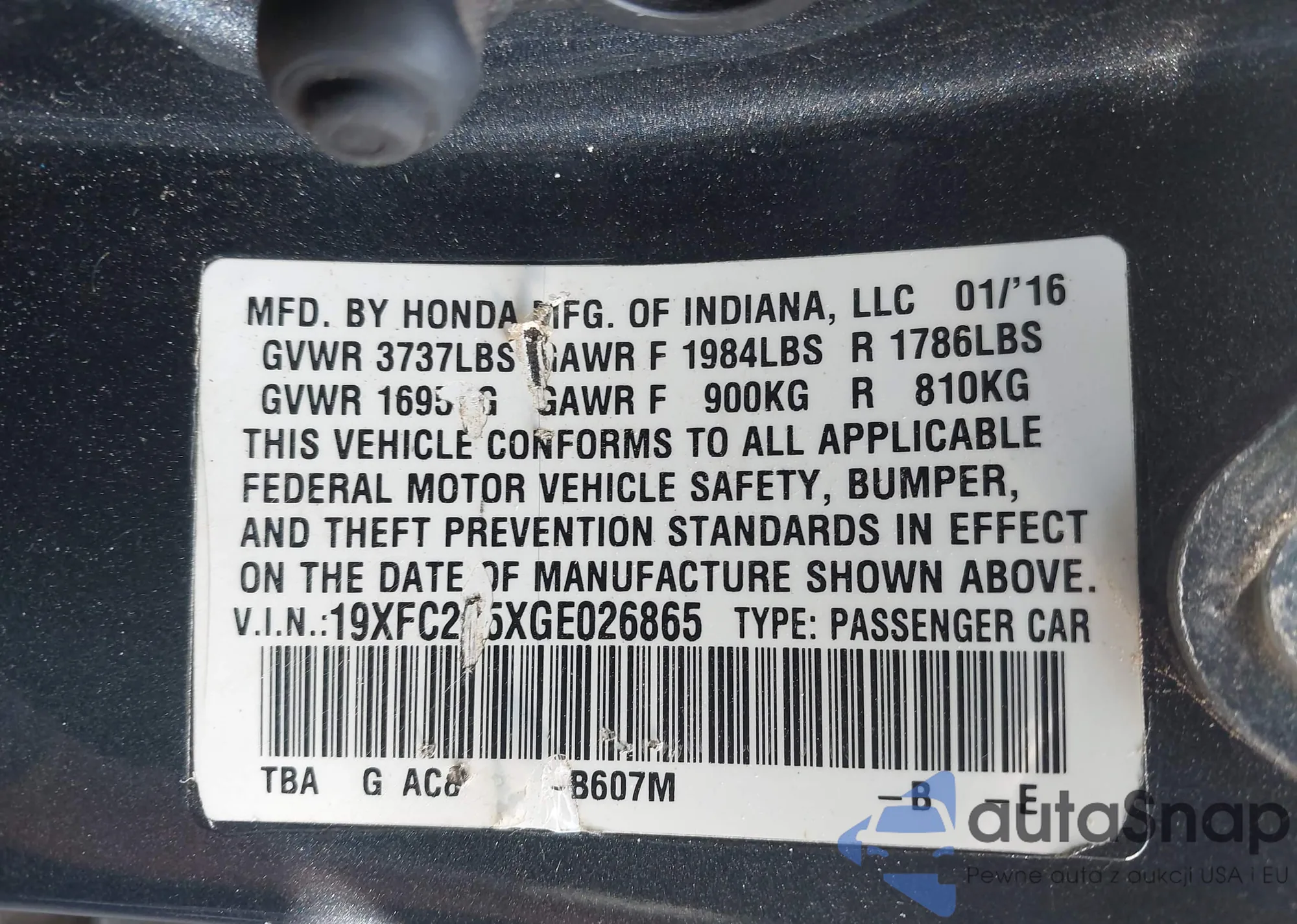 LOT: 43132918 VIN: 19XFC2F5XGE026865