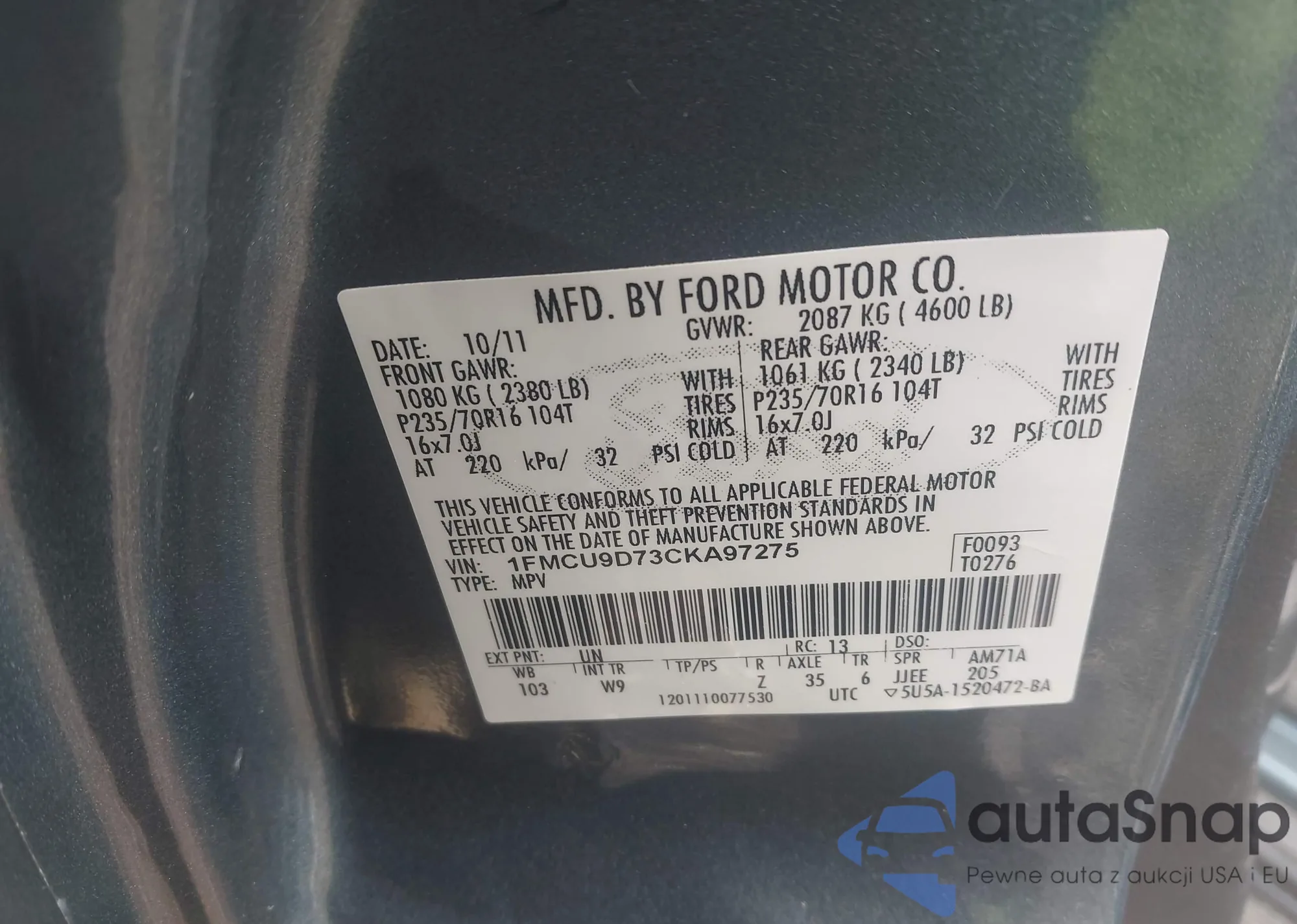 • VIN 1FMCU9D73CKA97275