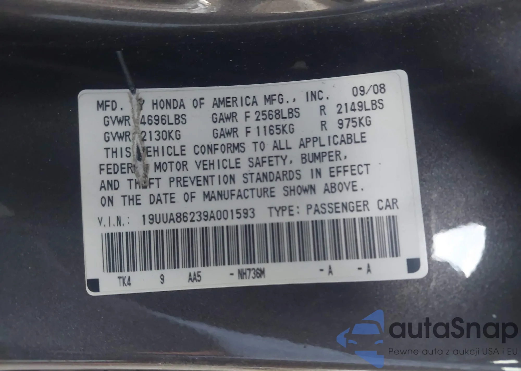 LOT: 43295279 VIN: 19UUA86239A001593