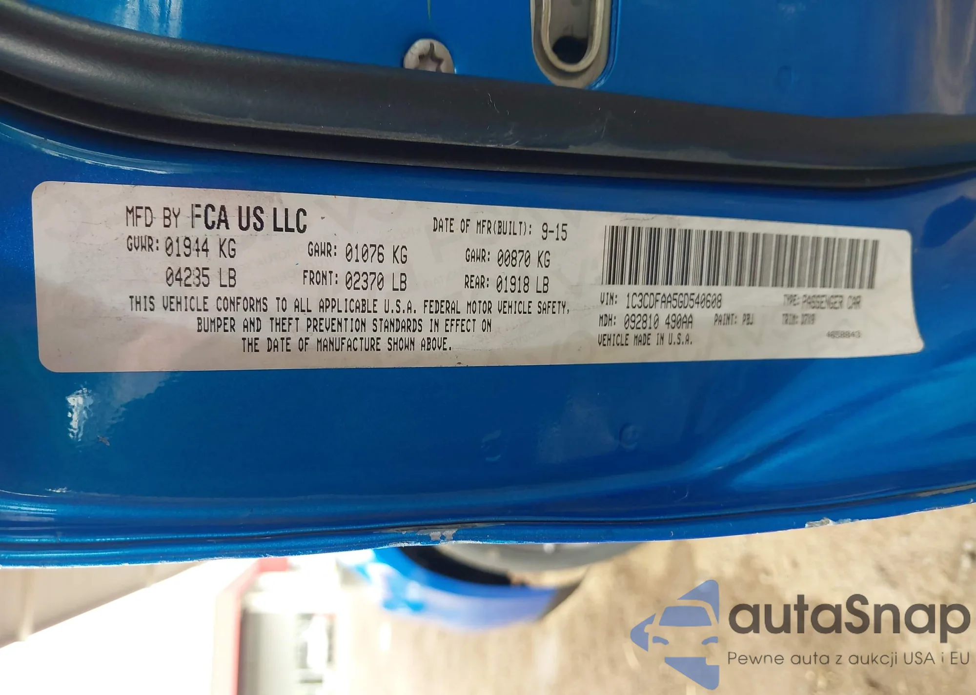 • VIN 1C3CDFAA5GD540608