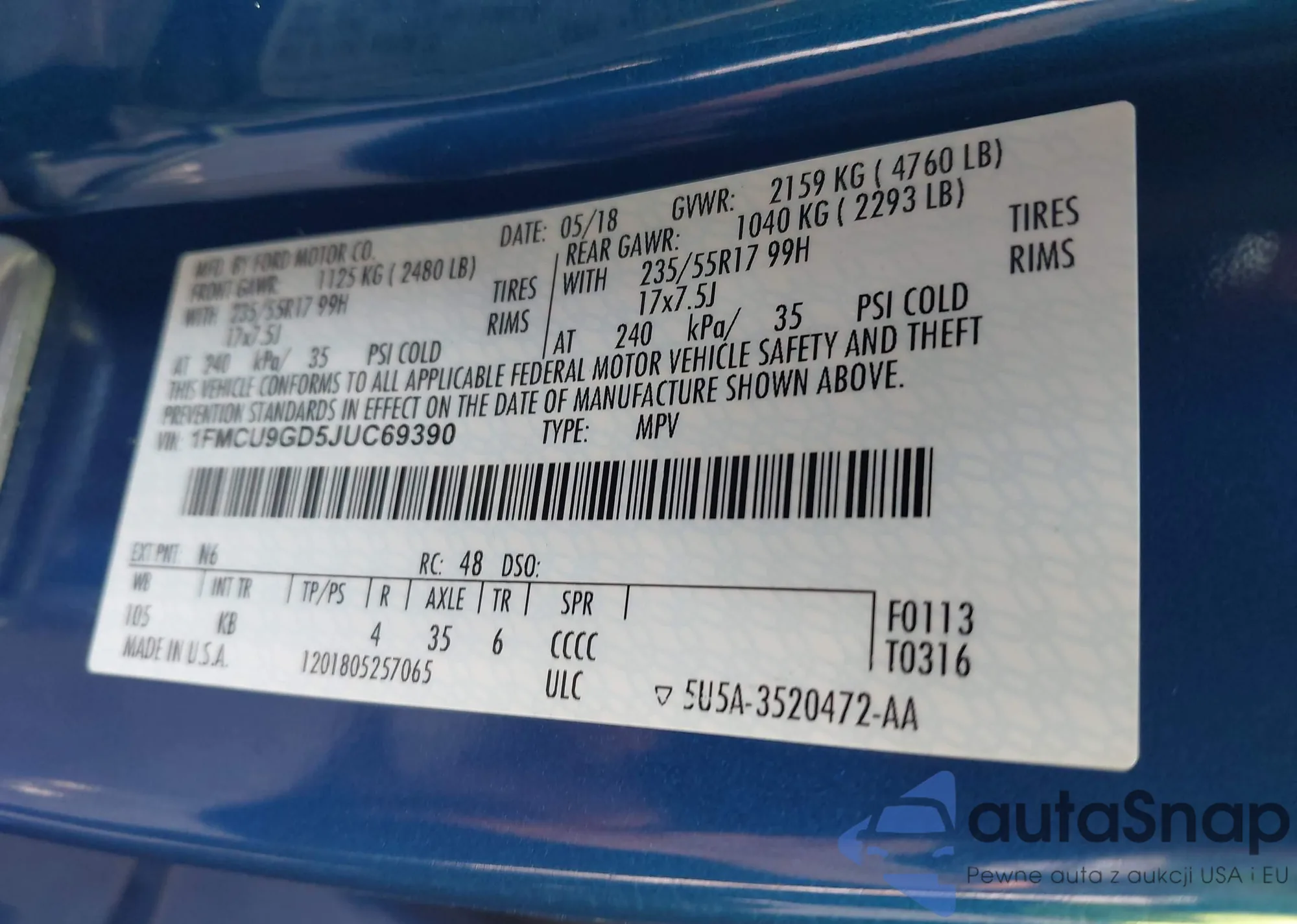 • VIN 1FMCU9GD5JUC69390