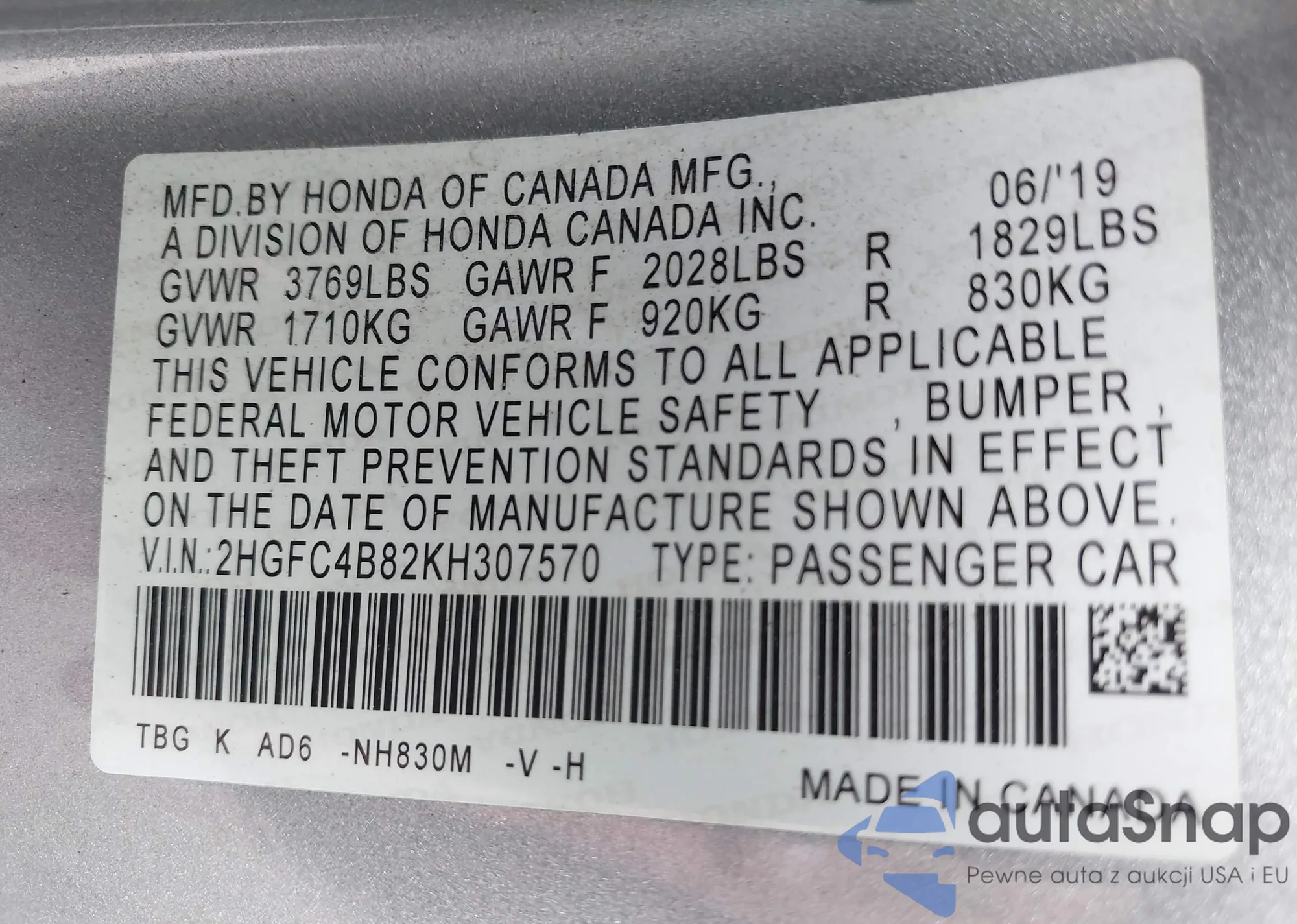 • VIN 2HGFC4B82KH307570