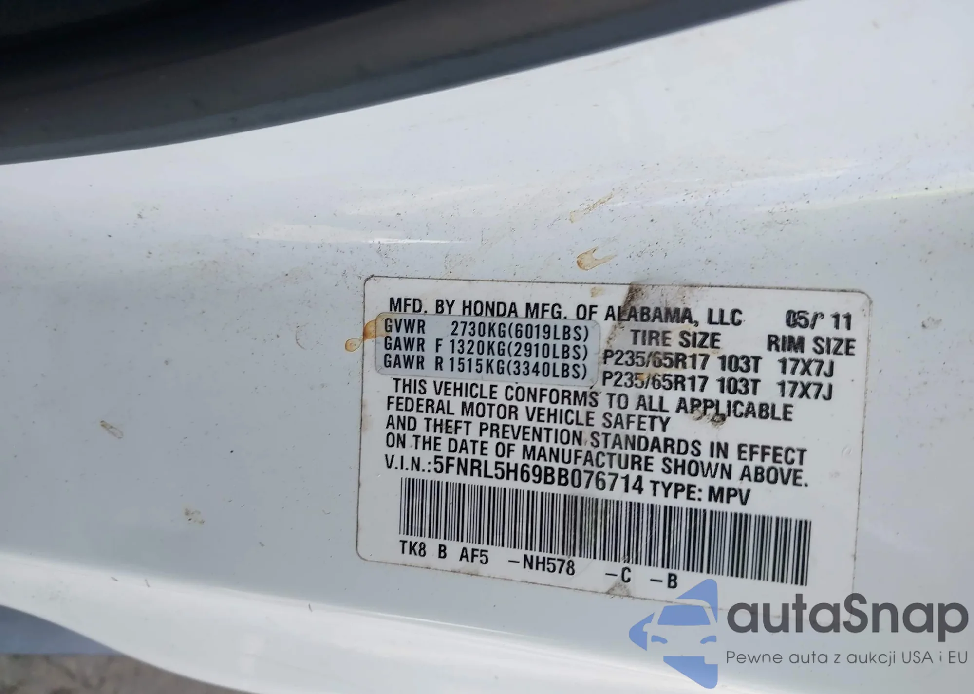 LOT: 43193594 VIN: 5FNRL5H69BB076714