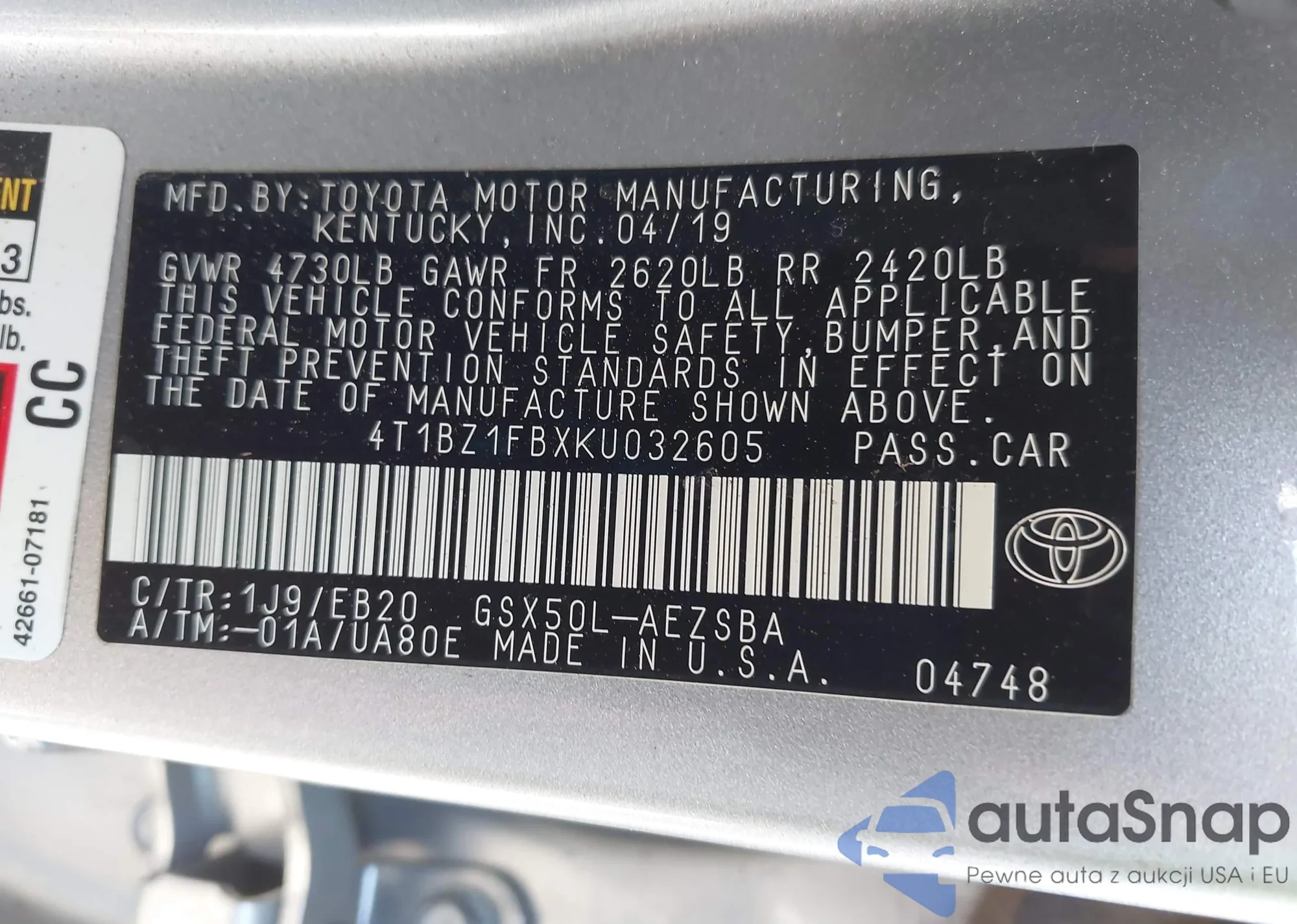 LOT: 43250171 VIN: 4T1BZ1FBXKU032605