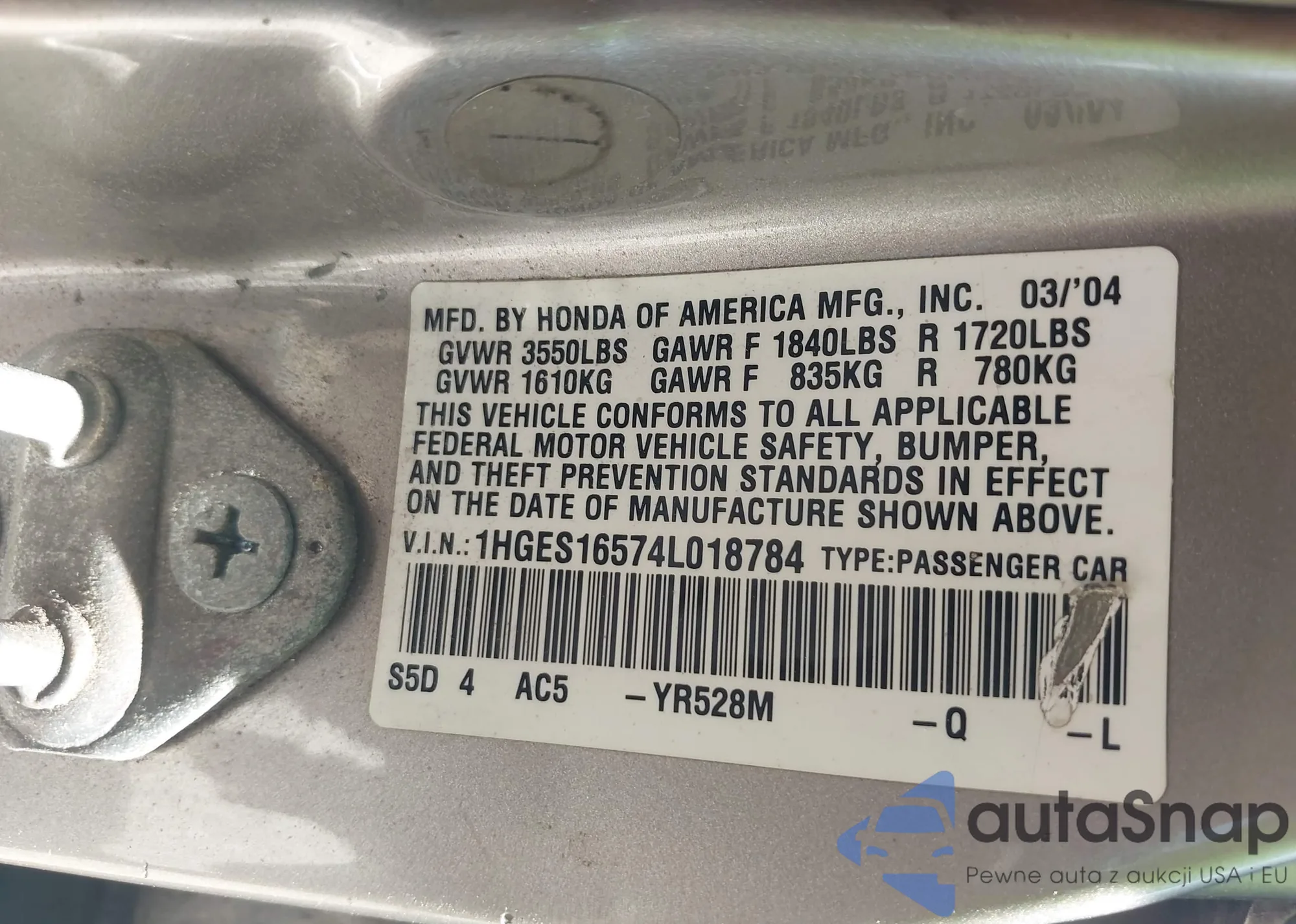 LOT: 42805697 VIN: 1HGES16574L018784