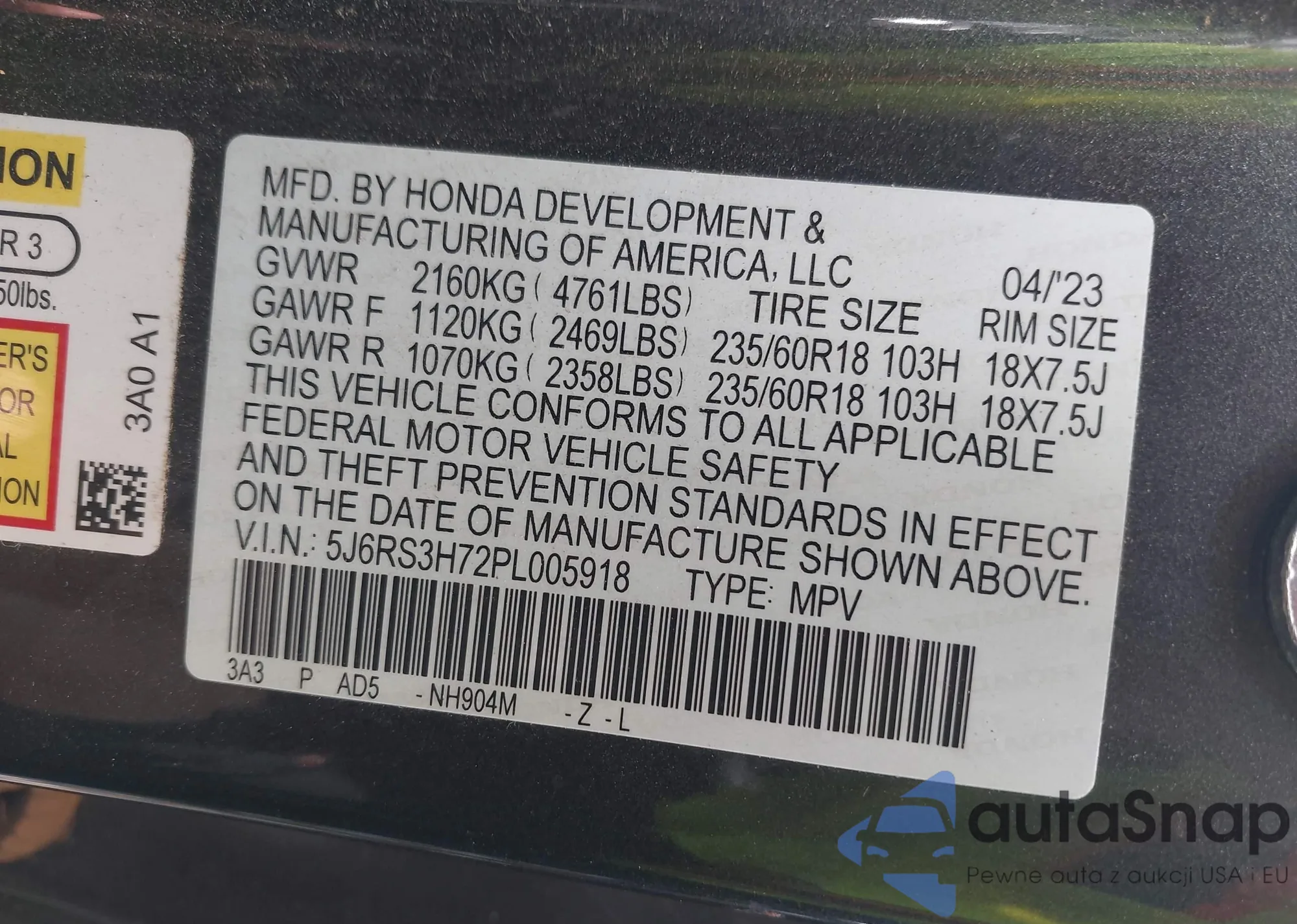 • VIN 5J6RS3H72PL005918