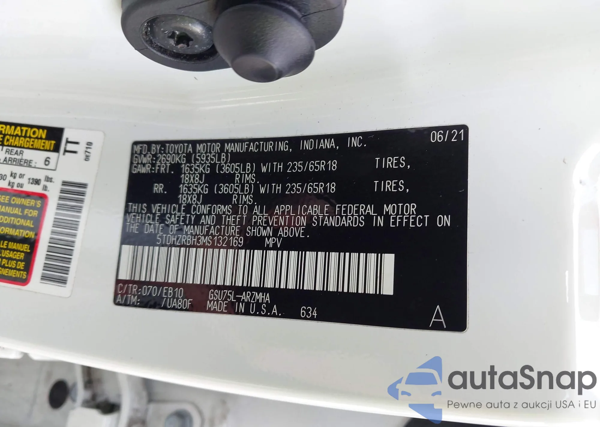 LOT: 43118212 VIN: 5TDYARAH0MS507749