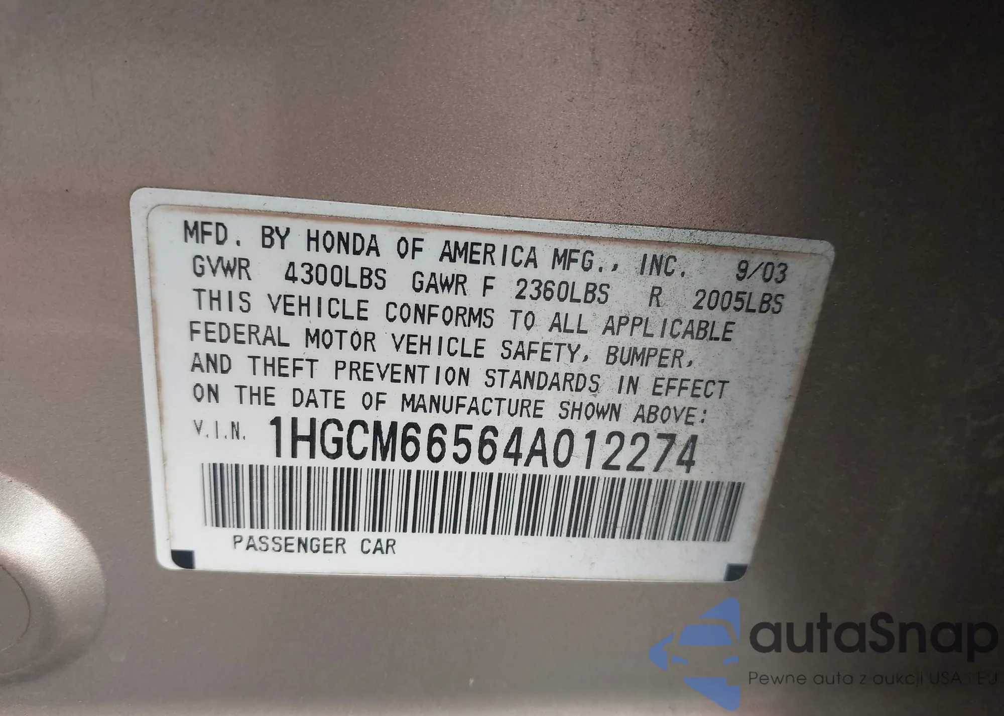 • VIN 1HGCM66564A012274