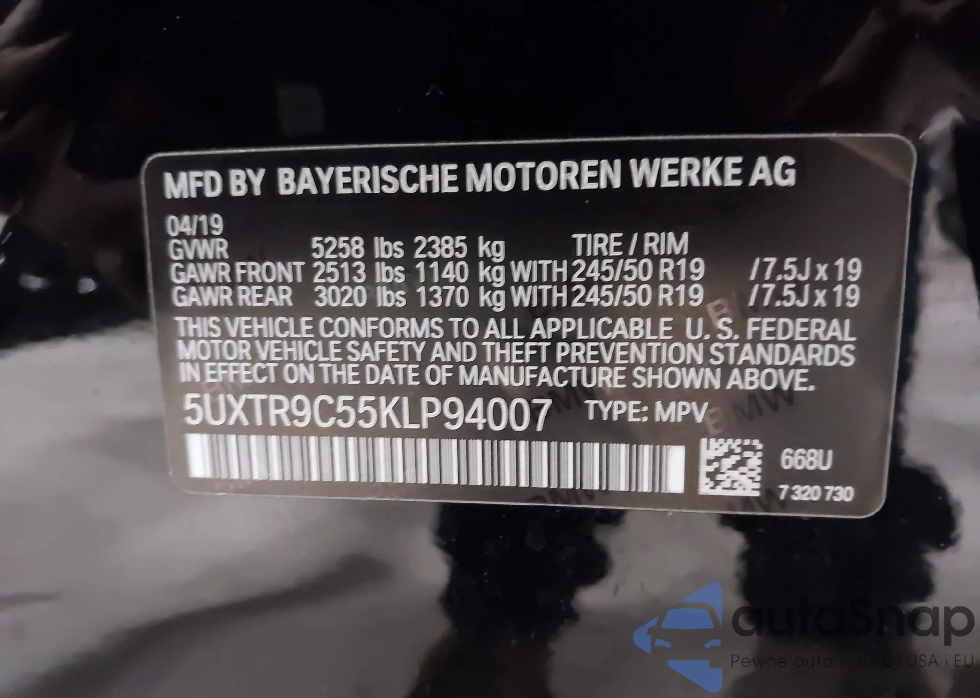 • VIN 5UXTR9C55KLP94007