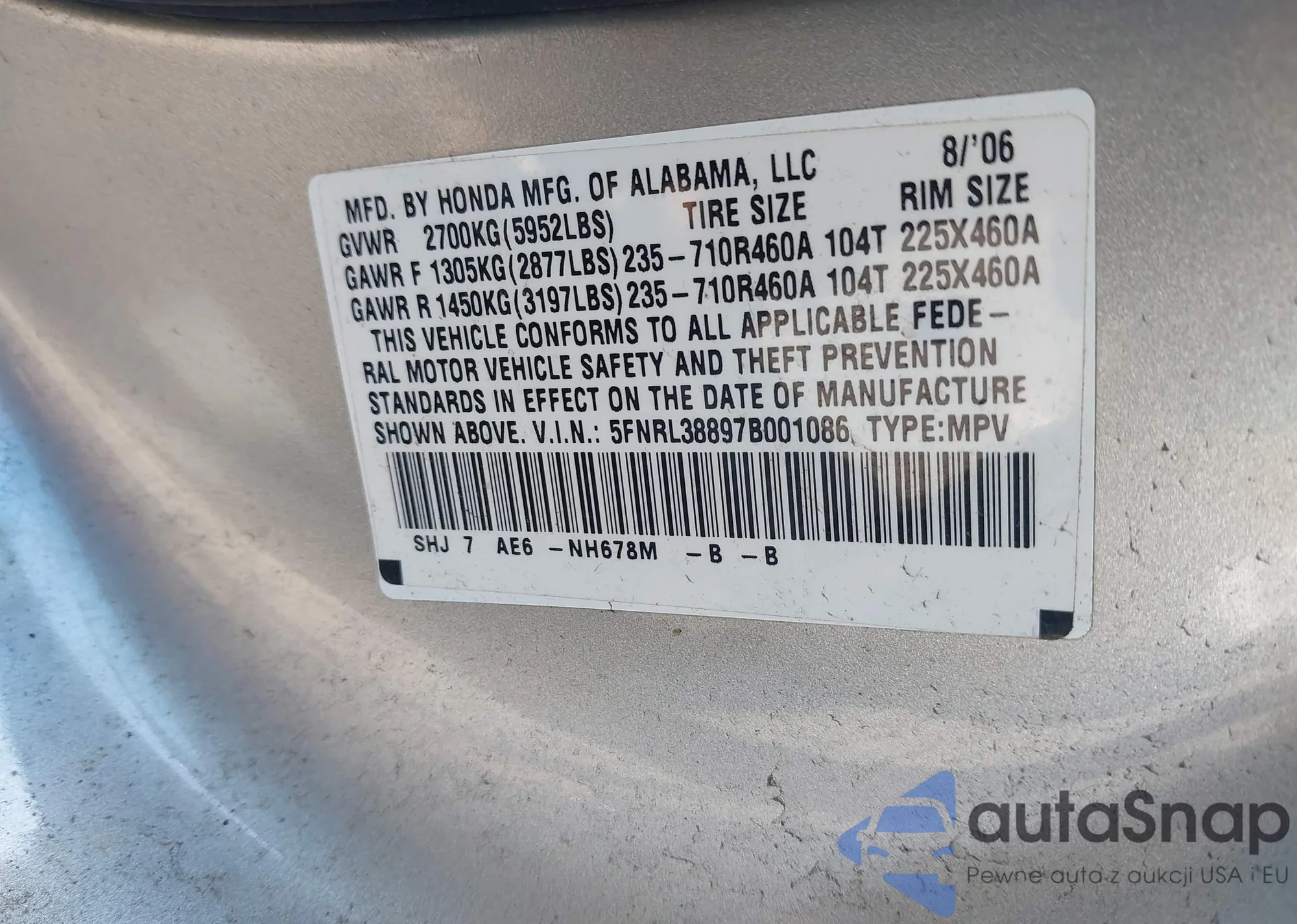 LOT: 43133407 VIN: 5FNRL38897B001086