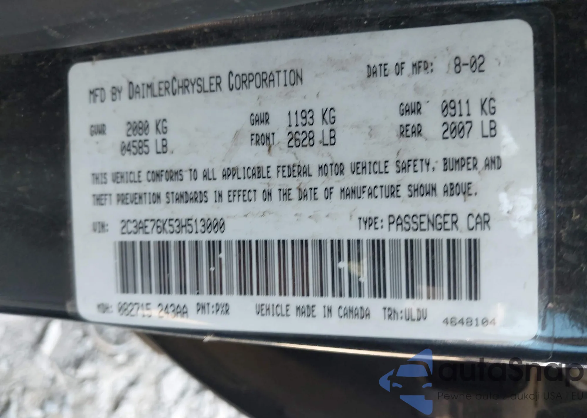 • VIN 2C3AE76K53H513000