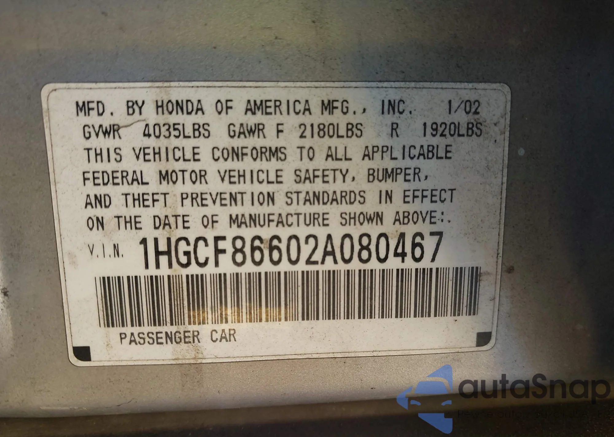 LOT: 43391273 VIN: 1HGCG66561A082456