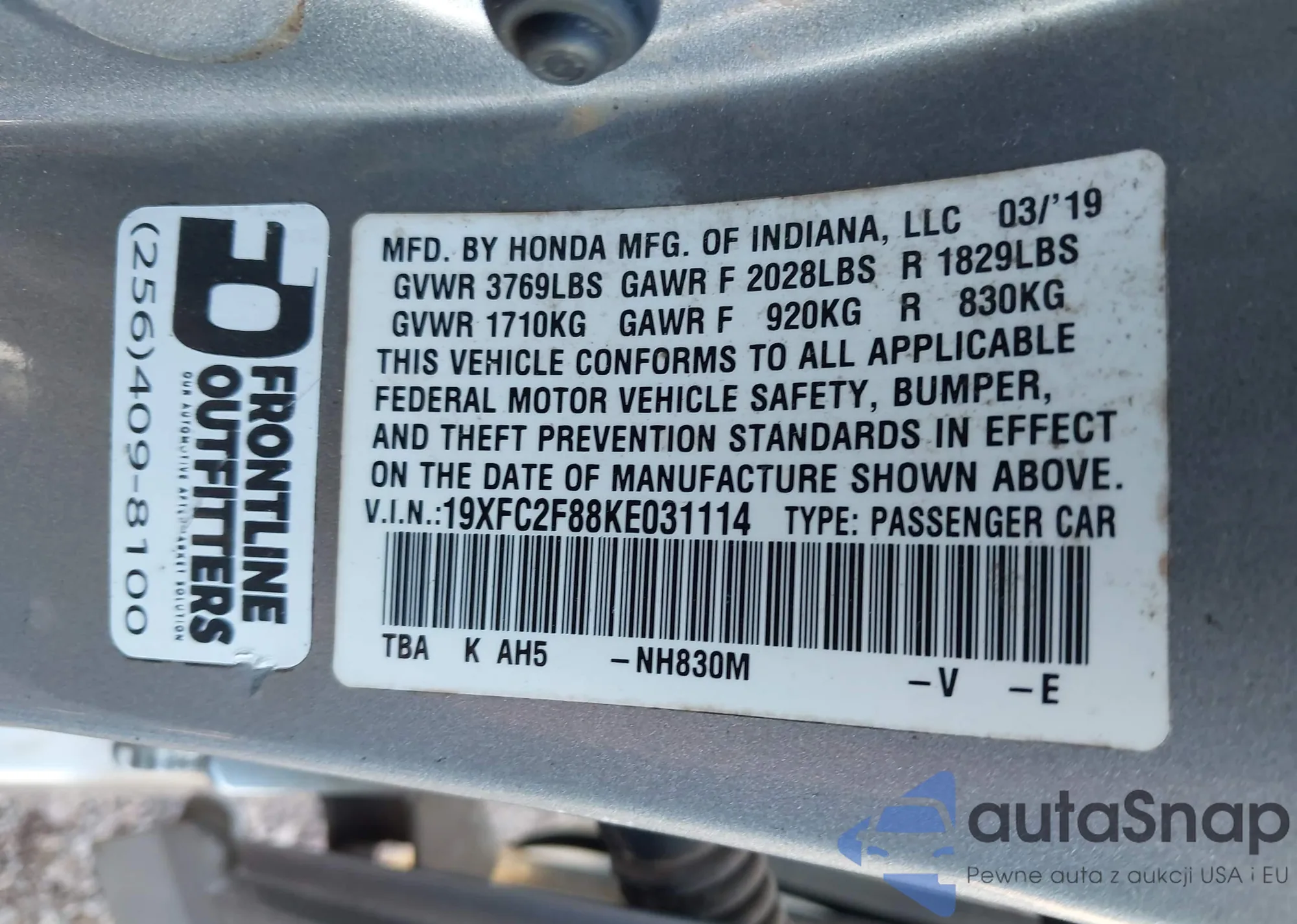 • VIN 19XFC2F88KE031114