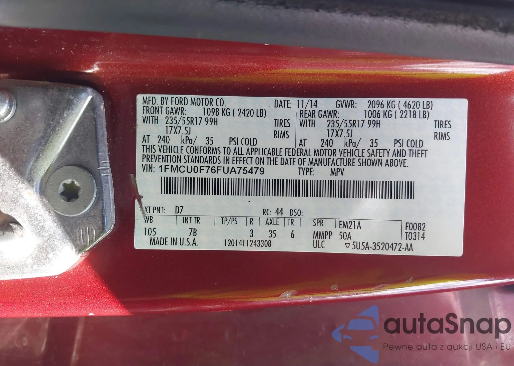 • VIN 1FMCU0F76FUA75479