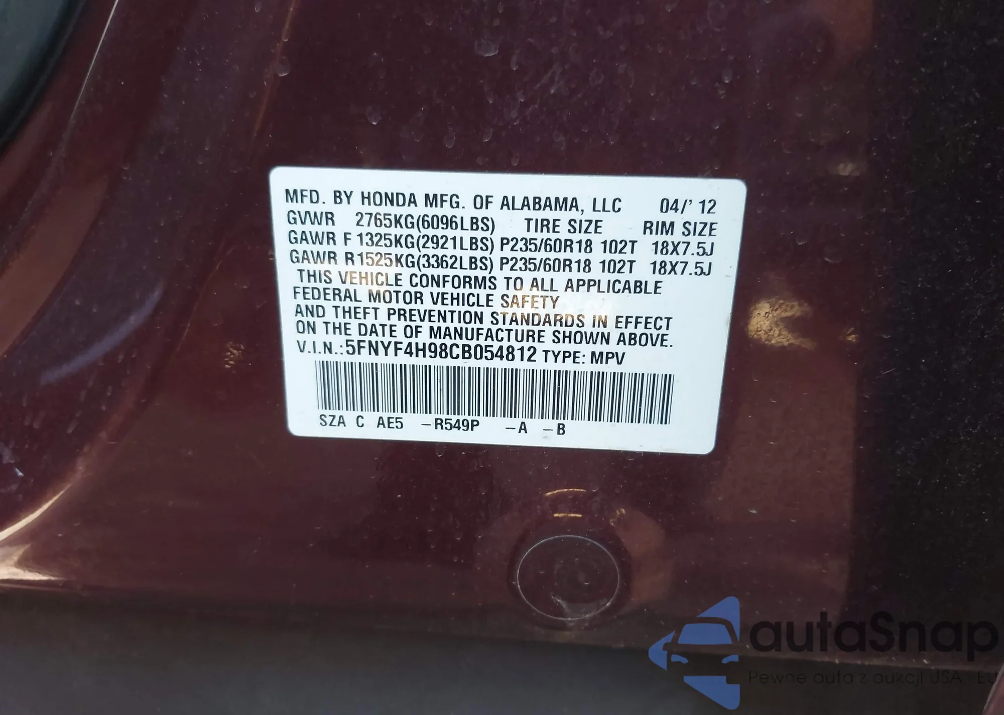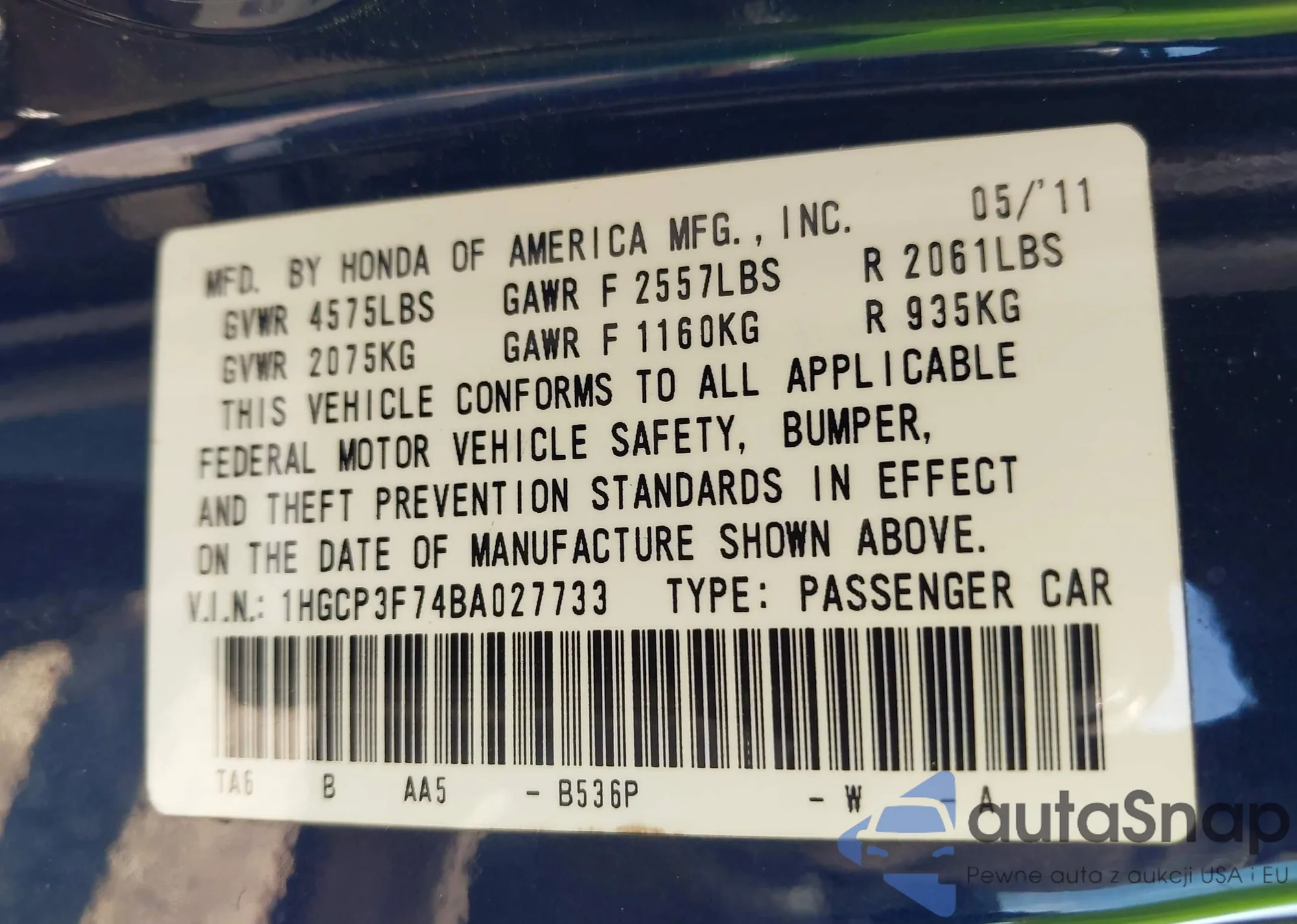 LOT: 42895958 VIN: 1HGCP3F74BA027733