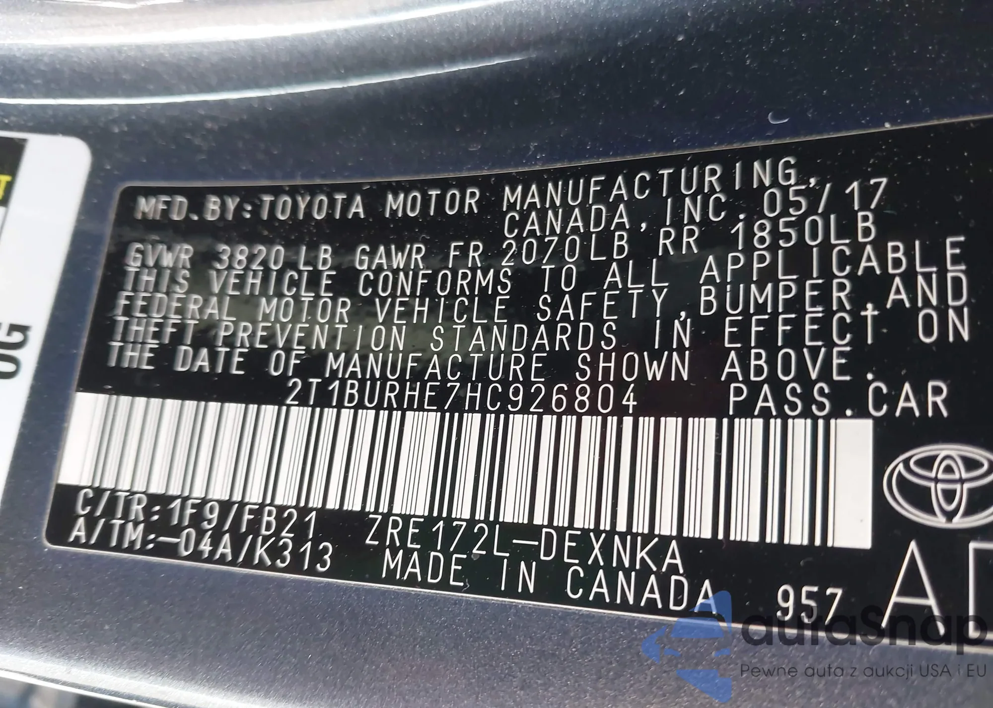 LOT: 43230049 VIN: 2T1BURHE7HC926804