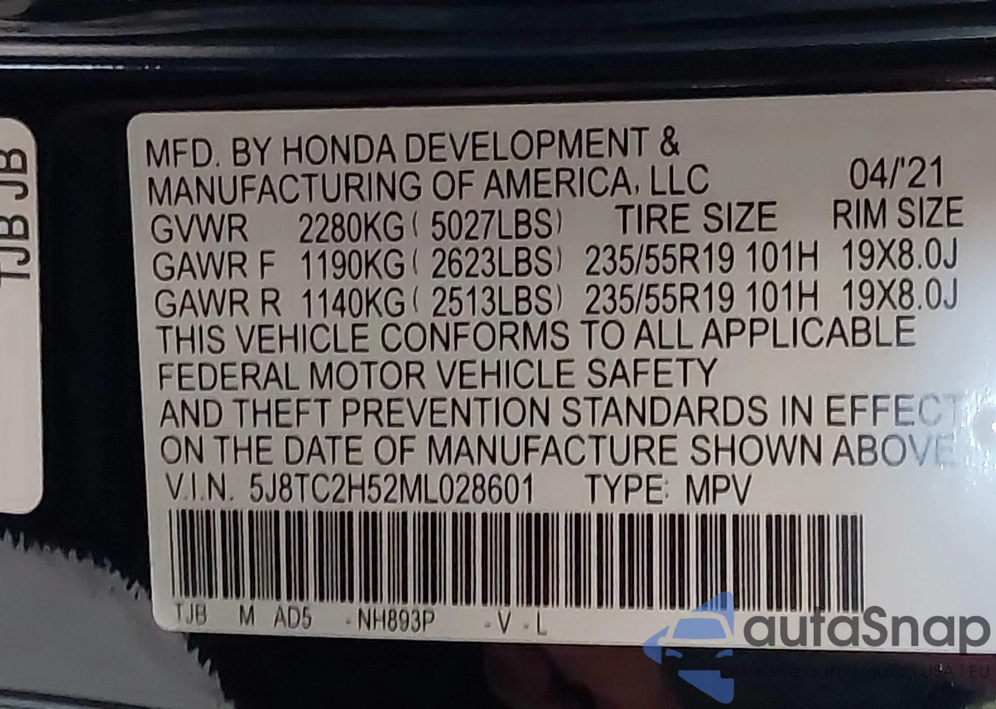 • VIN 5J8TC2H52ML028601