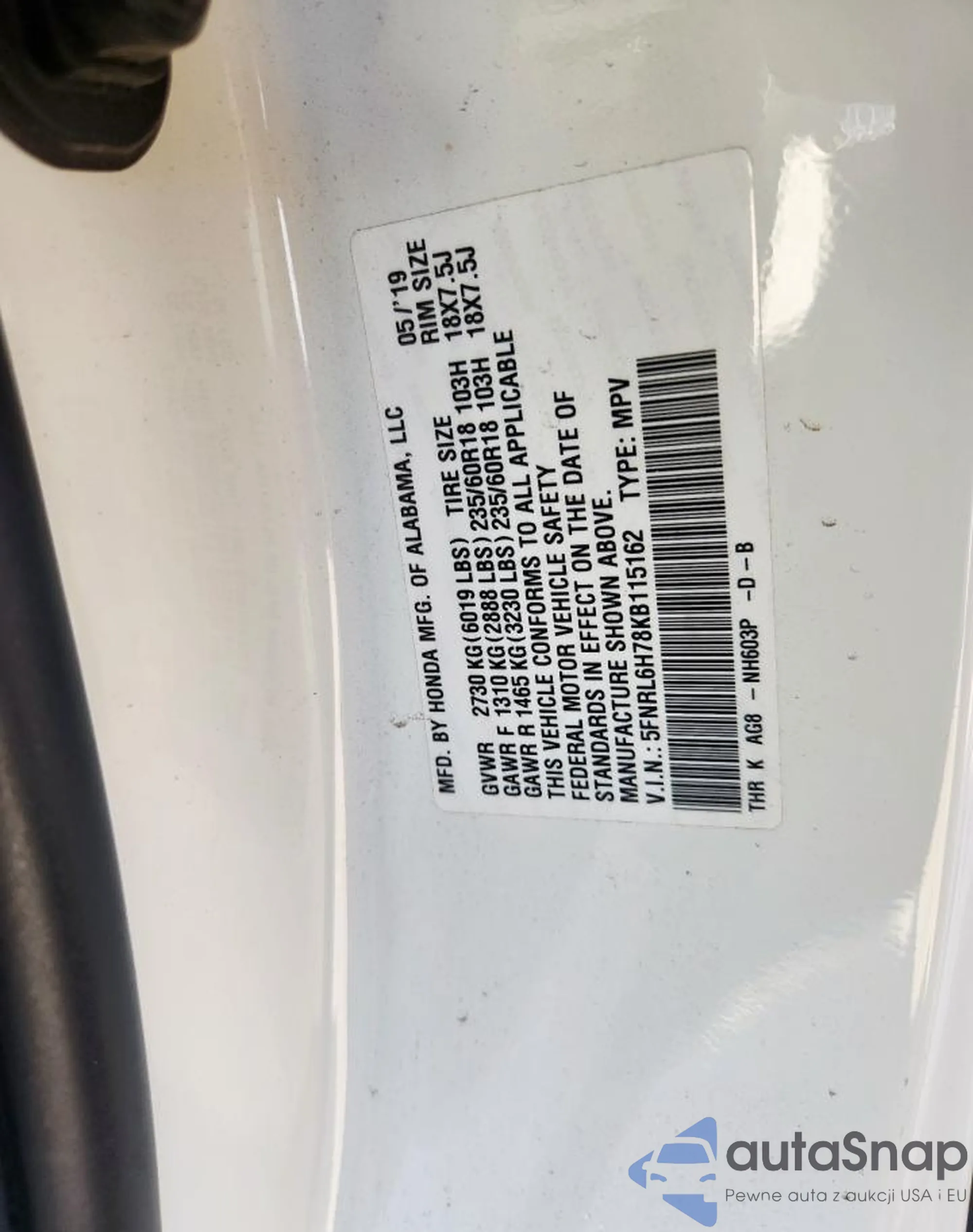 • VIN 5FNRL6H78KB115162