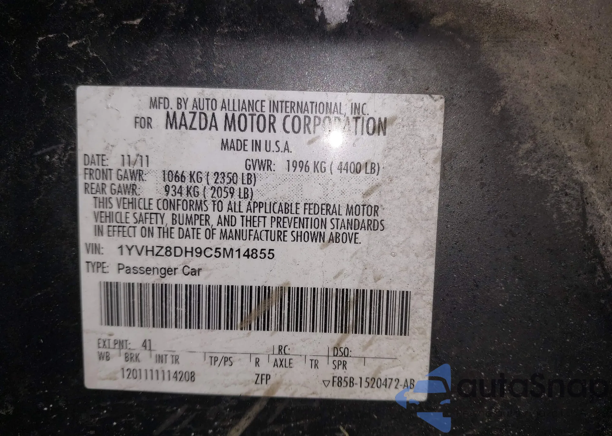 • VIN 1YVHZ8DH9C5M14855