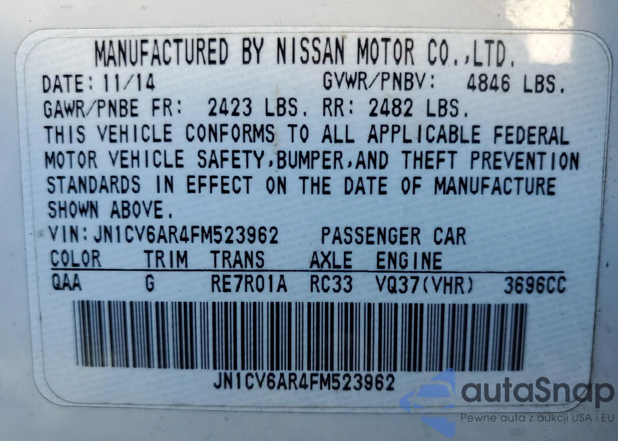 • VIN JN1CV6AR4FM523962