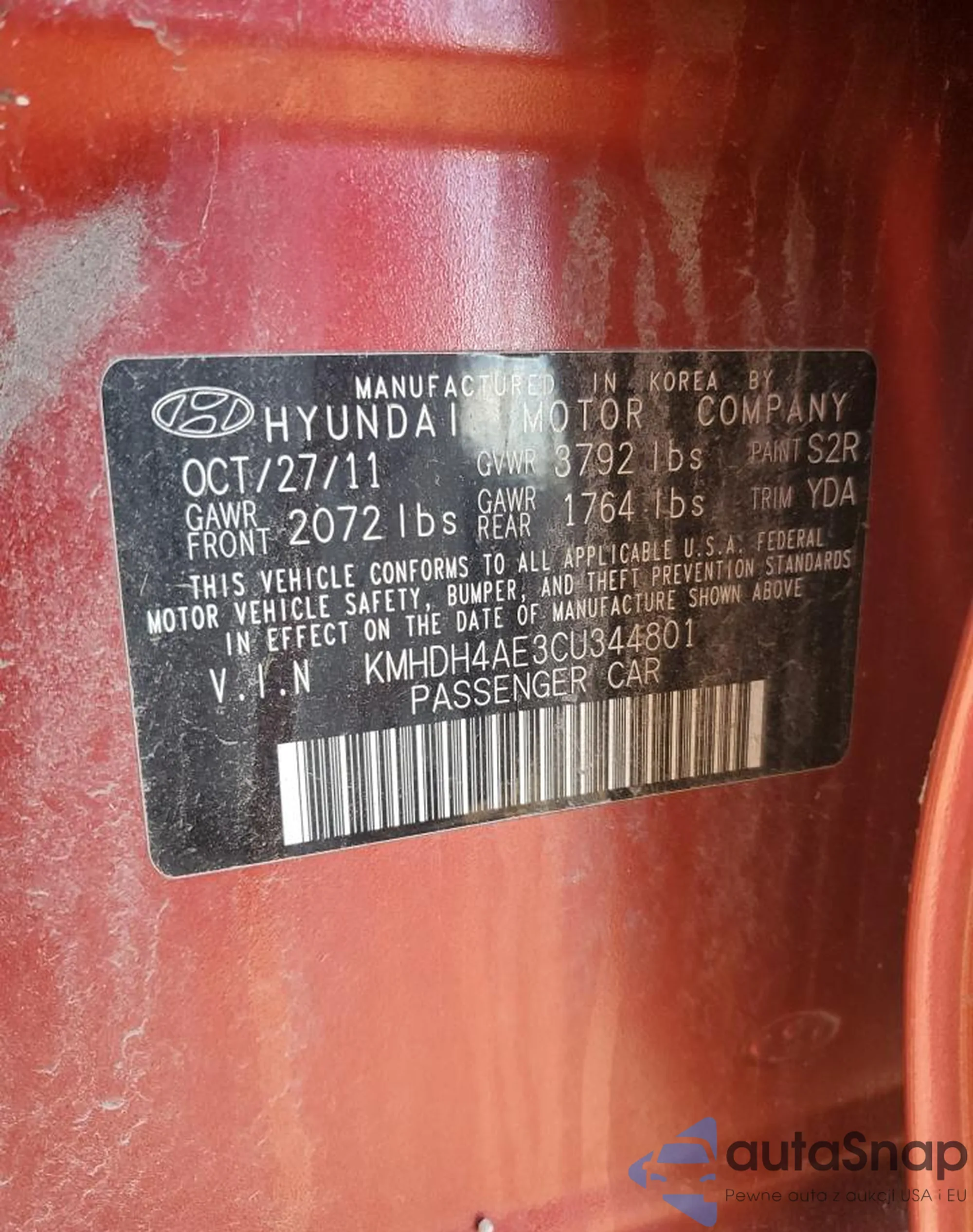 LOT: 85105085 VIN: KMHDH4AE3CU344801