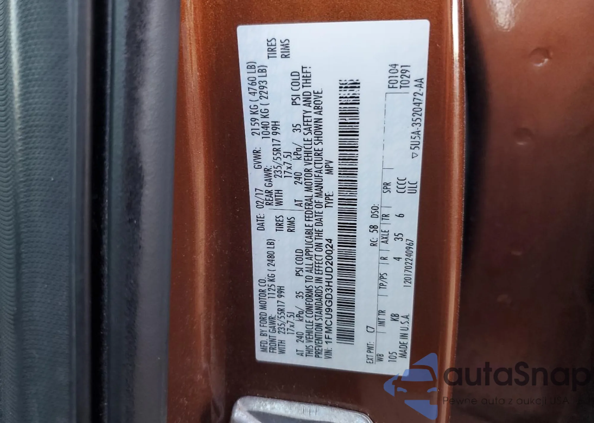 • VIN 1FMCU9GD3HUD20024