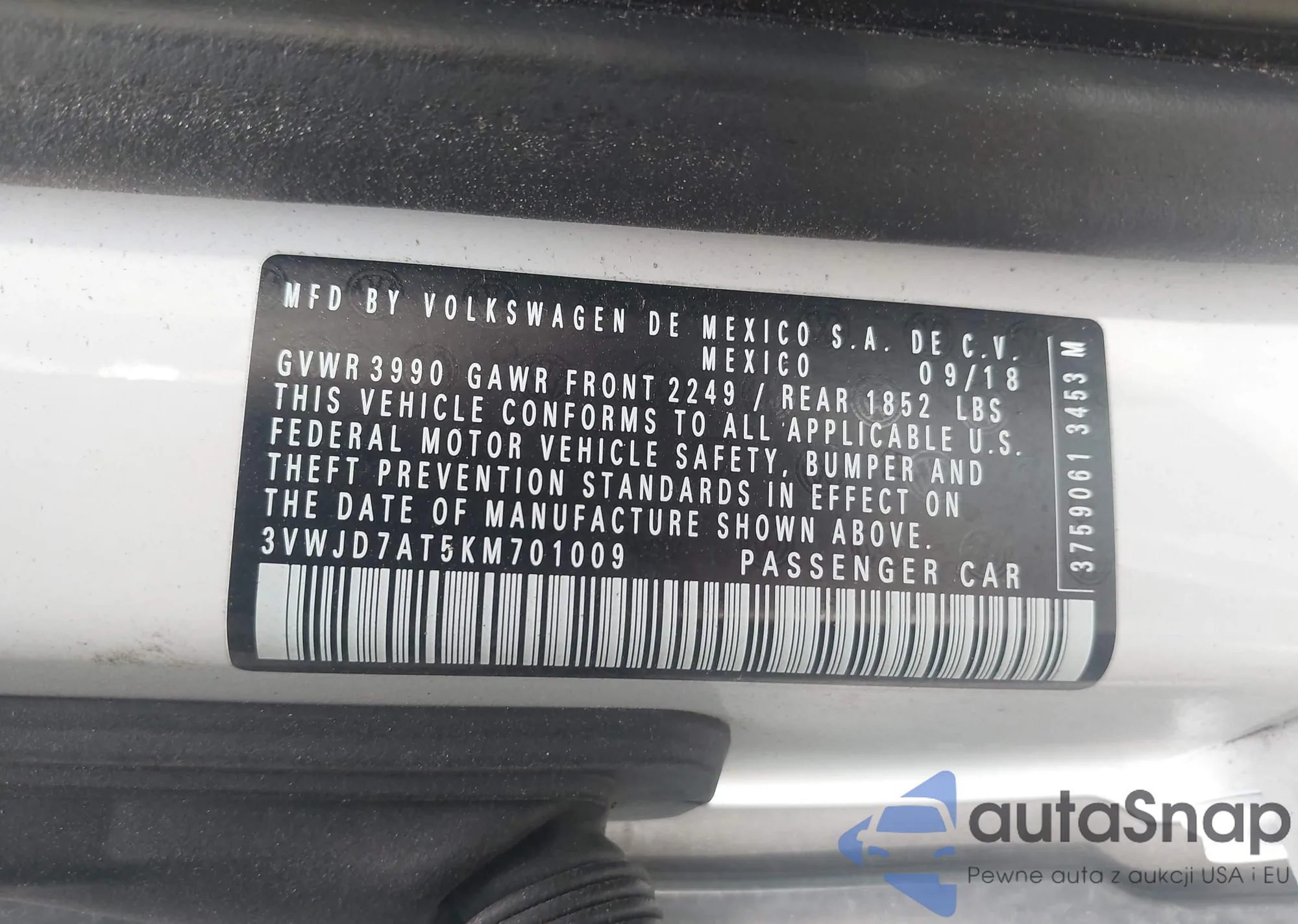 • VIN 3VWJD7AT5KM701009