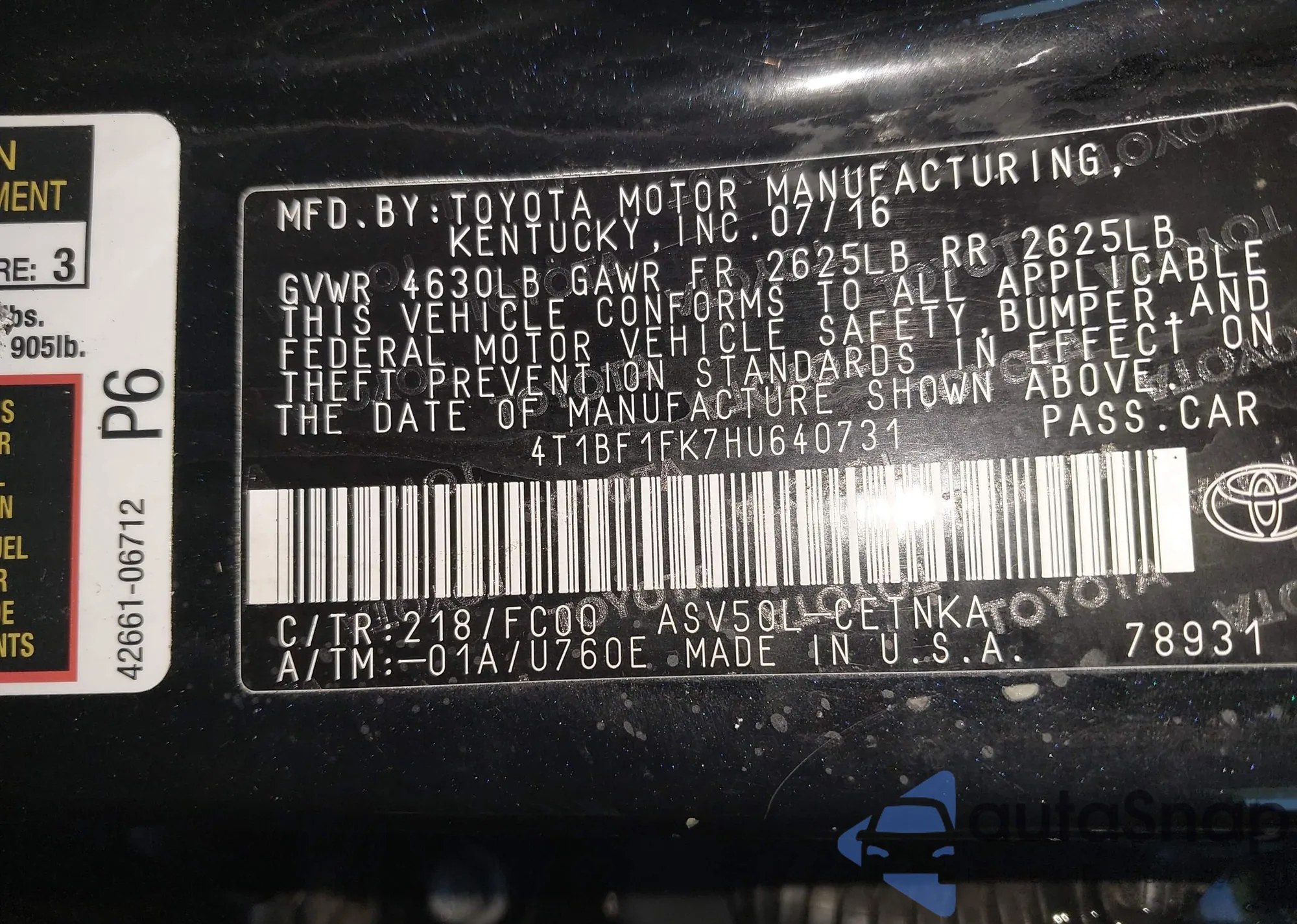 • VIN 4T1BF1FK7HU640731
