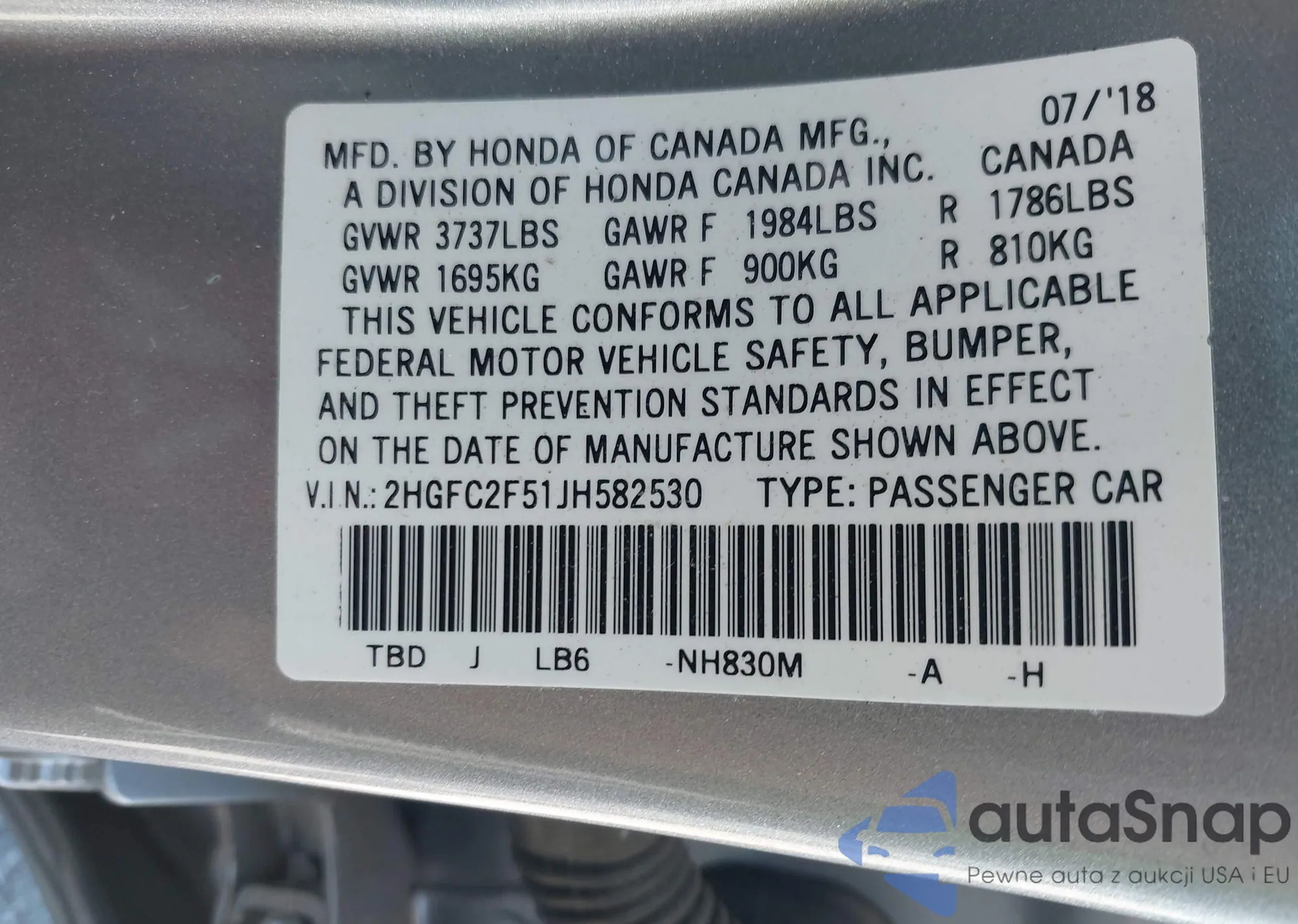 • VIN 2HGFC2F51JH582530