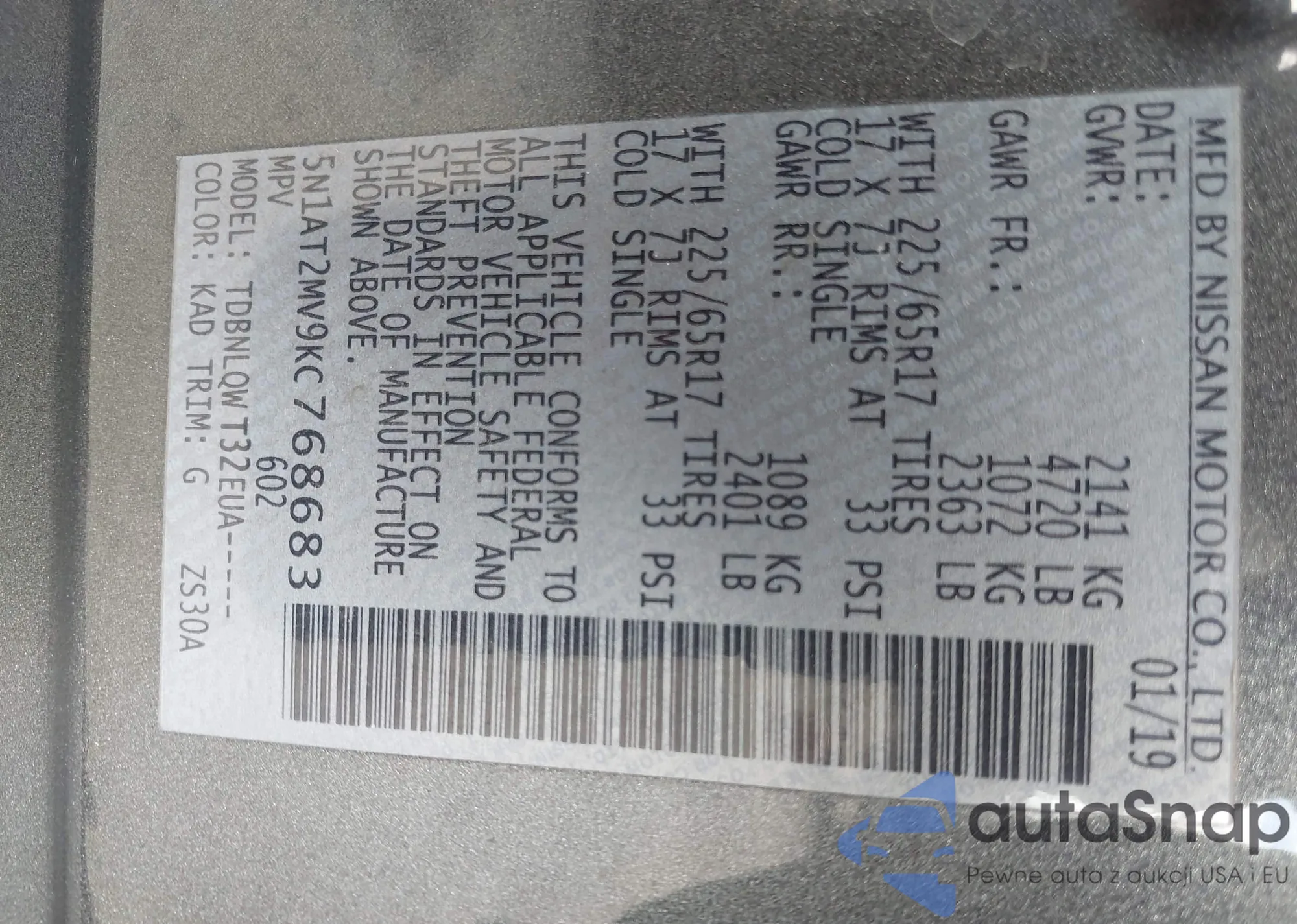 LOT: 42904080 VIN: 5N1AT2MV9KC768683