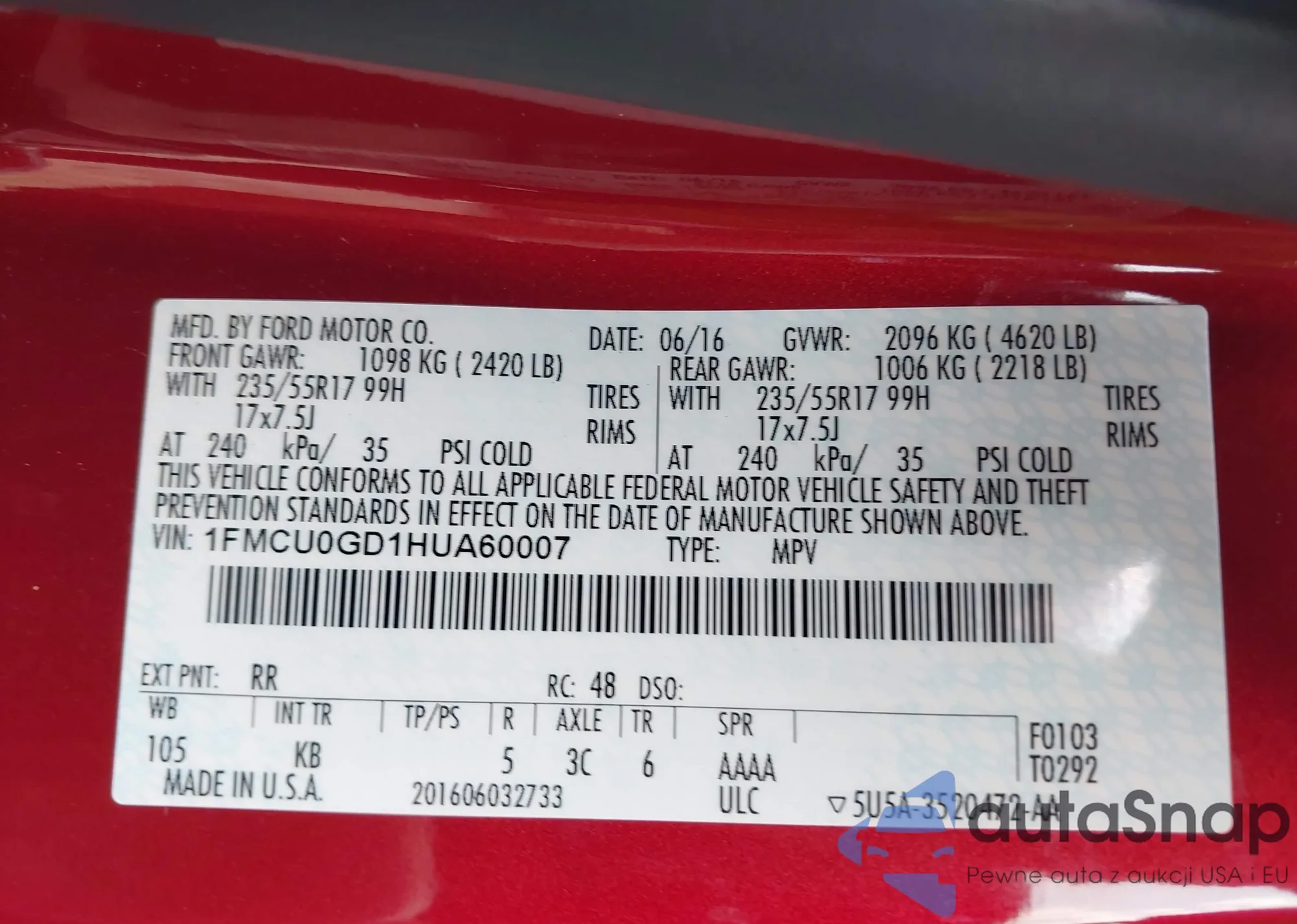 LOT: 42996086 VIN: 1FMCU0GD1HUA60007